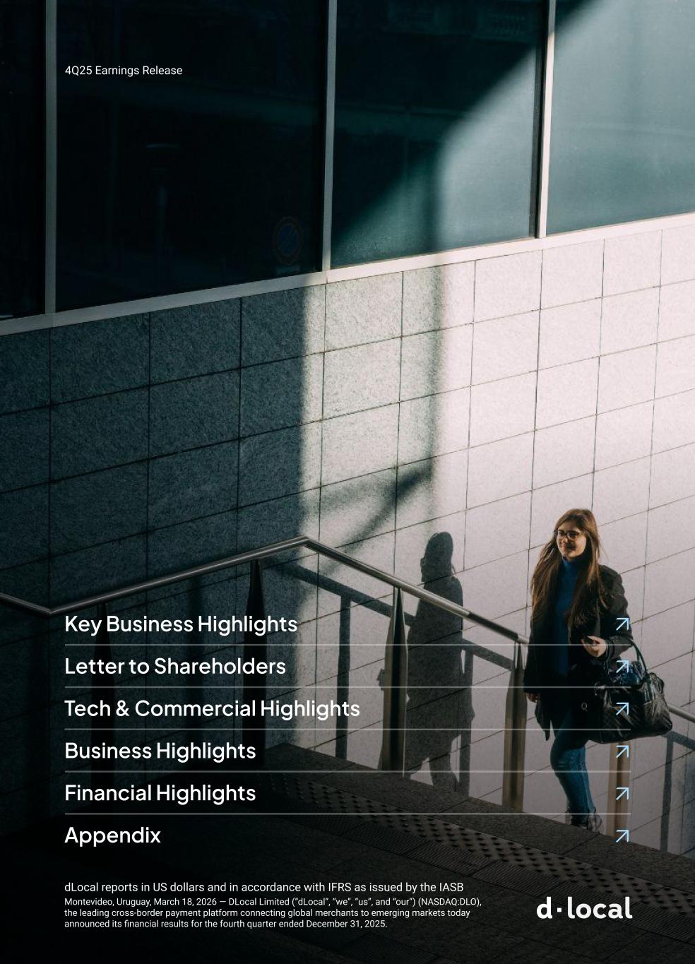 4Q25 Earnings Release dLocal reports in US dollars and in accordance with IFRS as issued by the IASB Montevideo, Uruguay, March 18, 2026 — DLocal Limited (“dLocal”, “we”, “us”, and “our”) (NASDAQ:DLO), the leading cross-border payment platform connecting global merchants to emerging markets today announced its financial results for the fourth quarter ended December 31, 2025. Key Business Highlights Letter to Shareholders Business Highlights Financial Highlights Tech & Commercial Highlights Appendix