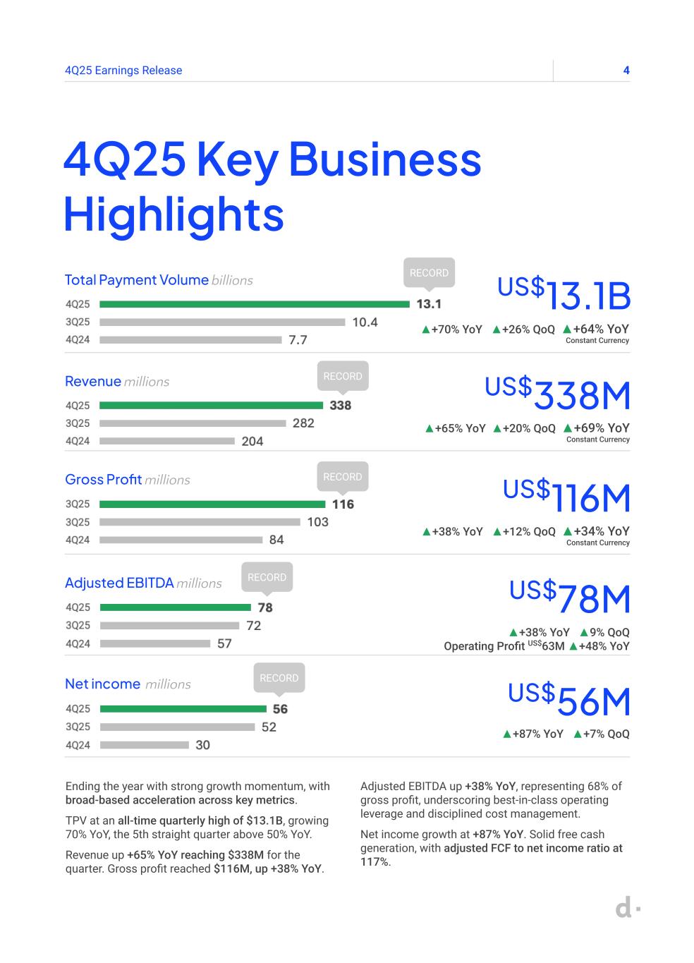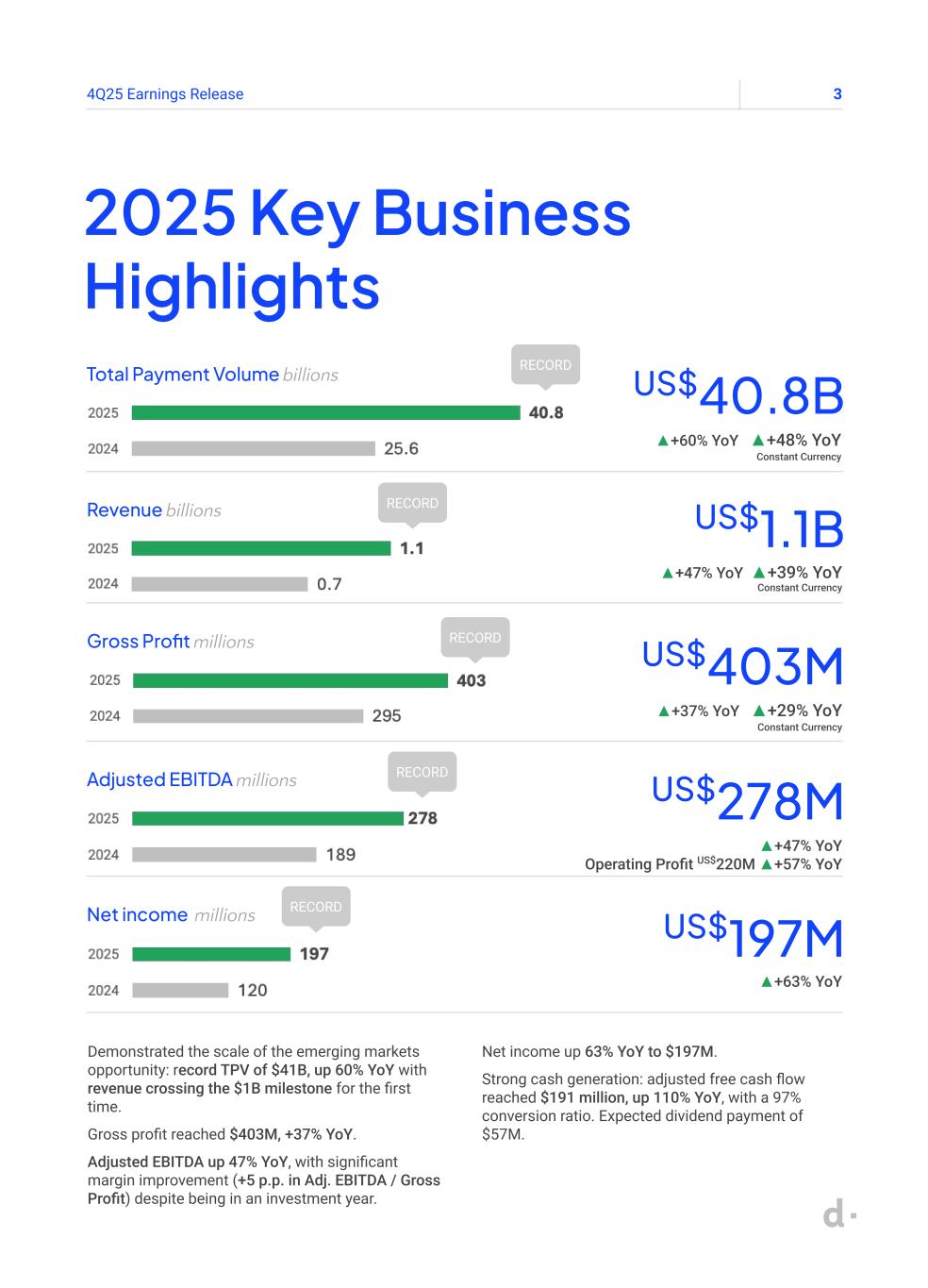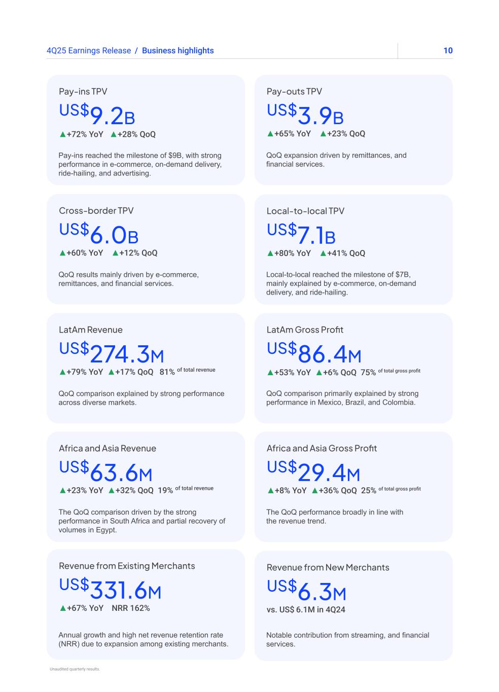 44Q25 Earnings Release 4Q25 Key Business Highlights Total Payment Volume billions US$13.1B ▲+70% YoY ▲+26% QoQ ▲+64% YoY Constant Currency RECORD Ending the year with strong growth momentum, with broad-based acceleration across key metrics. TPV at an all-time quarterly high of $13.1B, growing 70% YoY, the 5th straight quarter above 50% YoY. Revenue up +65% YoY reaching $338M for the quarter. Gross profit reached $116M, up +38% YoY. Adjusted EBITDA up +38% YoY, representing 68% of gross profit, underscoring best-in-class operating leverage and disciplined cost management. Net income growth at +87% YoY. Solid free cash generation, with adjusted FCF to net income ratio at 117%. Revenue millions US$338M ▲+65% YoY ▲+20% QoQ ▲+69% YoY Constant Currency Gross Profit millions US$116M ▲+38% YoY ▲+12% QoQ ▲+34% YoY Constant Currency Adjusted EBITDA millions US$78M ▲+38% YoY ▲9% QoQ Operating Profit US$63M ▲+48% YoY Net income millions US$56M ▲+87% YoY ▲+7% QoQ RECORD RECORD RECORD RECORD