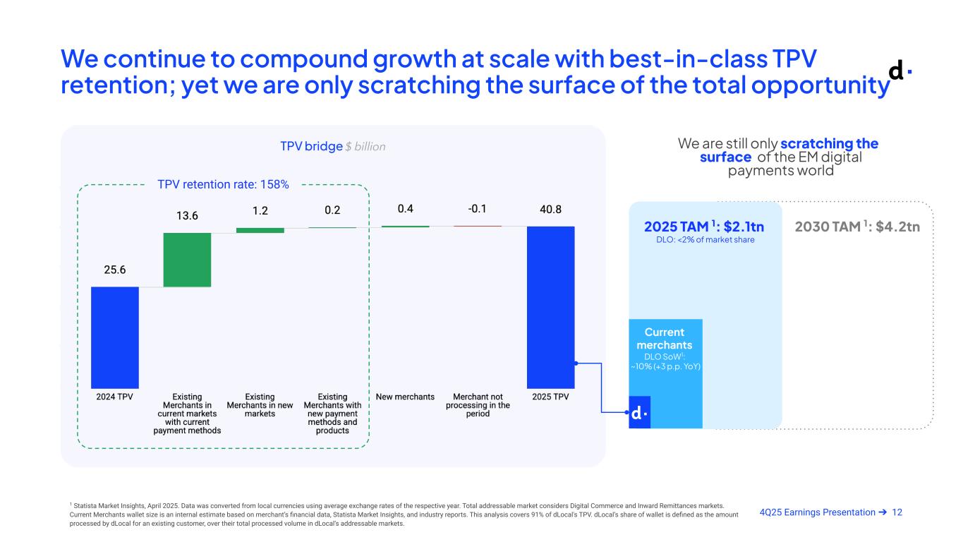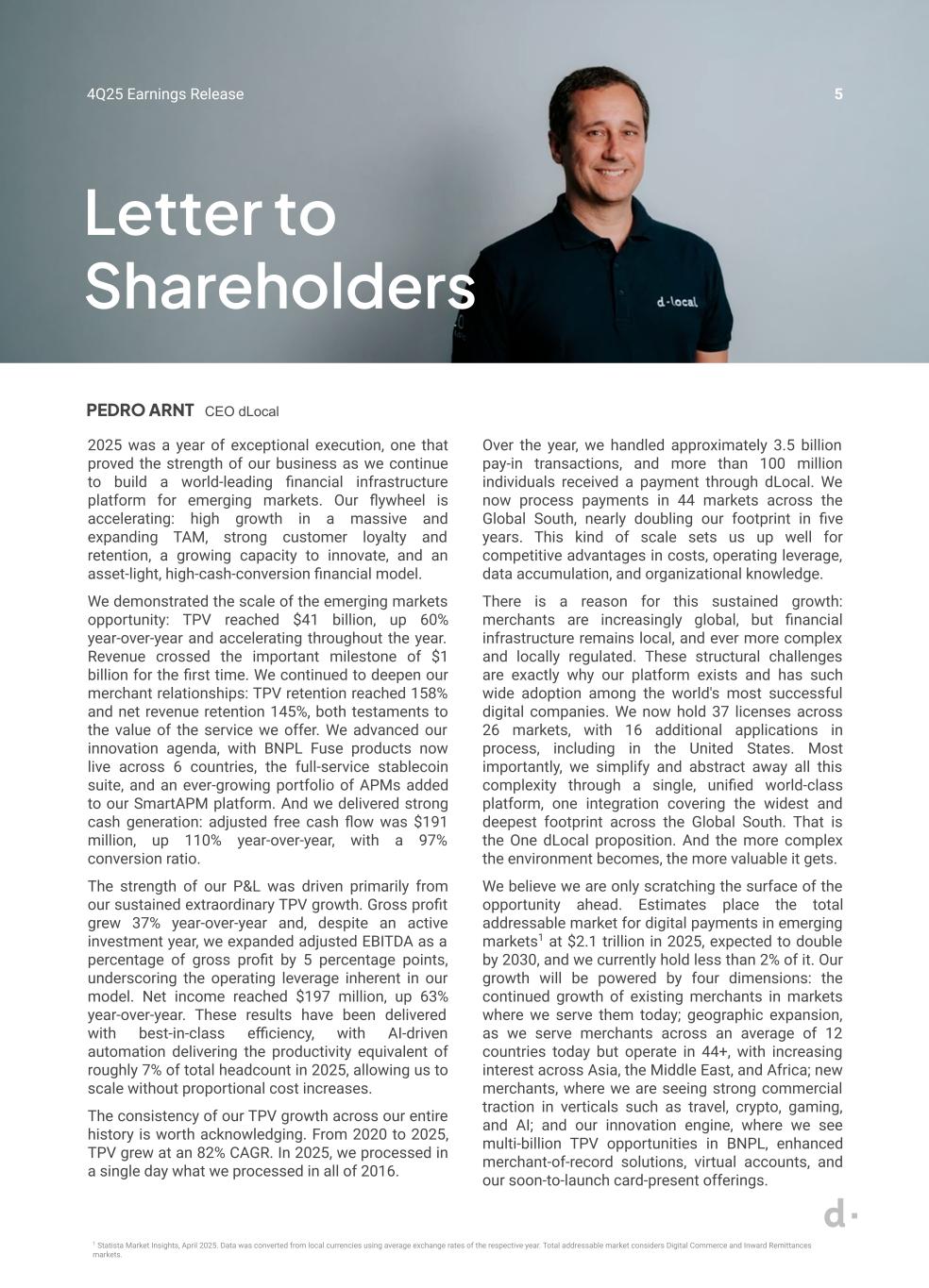 54Q25 Earnings Release 2025 was a year of exceptional execution, one that proved the strength of our business as we continue to build a world-leading financial infrastructure platform for emerging markets. Our flywheel is accelerating: high growth in a massive and expanding TAM, strong customer loyalty and retention, a growing capacity to innovate, and an asset-light, high-cash-conversion financial model. We demonstrated the scale of the emerging markets opportunity: TPV reached $41 billion, up 60% year-over-year and accelerating throughout the year. Revenue crossed the important milestone of $1 billion for the first time. We continued to deepen our merchant relationships: TPV retention reached 158% and net revenue retention 145%, both testaments to the value of the service we offer. We advanced our innovation agenda, with BNPL Fuse products now live across 6 countries, the full-service stablecoin suite, and an ever-growing portfolio of APMs added to our SmartAPM platform. And we delivered strong cash generation: adjusted free cash flow was $191 million, up 110% year-over-year, with a 97% conversion ratio. The strength of our P&L was driven primarily from our sustained extraordinary TPV growth. Gross profit grew 37% year-over-year and, despite an active investment year, we expanded adjusted EBITDA as a percentage of gross profit by 5 percentage points, underscoring the operating leverage inherent in our model. Net income reached $197 million, up 63% year-over-year. These results have been delivered with best-in-class efficiency, with AI-driven automation delivering the productivity equivalent of roughly 7% of total headcount in 2025, allowing us to scale without proportional cost increases. The consistency of our TPV growth across our entire history is worth acknowledging. From 2020 to 2025, TPV grew at an 82% CAGR. In 2025, we processed in a single day what we processed in all of 2016. 1 Statista Market Insights, April 2025. Data was converted from local currencies using average exchange rates of the respective year. Total addressable market considers Digital Commerce and Inward Remittances markets. Letter to Shareholders PEDRO ARNT CEO dLocal Over the year, we handled approximately 3.5 billion pay-in transactions, and more than 100 million individuals received a payment through dLocal. We now process payments in 44 markets across the Global South, nearly doubling our footprint in five years. This kind of scale sets us up well for competitive advantages in costs, operating leverage, data accumulation, and organizational knowledge. There is a reason for this sustained growth: merchants are increasingly global, but financial infrastructure remains local, and ever more complex and locally regulated. These structural challenges are exactly why our platform exists and has such wide adoption among the world's most successful digital companies. We now hold 37 licenses across 26 markets, with 16 additional applications in process, including in the United States. Most importantly, we simplify and abstract away all this complexity through a single, unified world-class platform, one integration covering the widest and deepest footprint across the Global South. That is the One dLocal proposition. And the more complex the environment becomes, the more valuable it gets. We believe we are only scratching the surface of the opportunity ahead. Estimates place the total addressable market for digital payments in emerging markets1 at $2.1 trillion in 2025, expected to double by 2030, and we currently hold less than 2% of it. Our growth will be powered by four dimensions: the continued growth of existing merchants in markets where we serve them today; geographic expansion, as we serve merchants across an average of 12 countries today but operate in 44+, with increasing interest across Asia, the Middle East, and Africa; new merchants, where we are seeing strong commercial traction in verticals such as travel, crypto, gaming, and AI; and our innovation engine, where we see multi-billion TPV opportunities in BNPL, enhanced merchant-of-record solutions, virtual accounts, and our soon-to-launch card-present offerings.