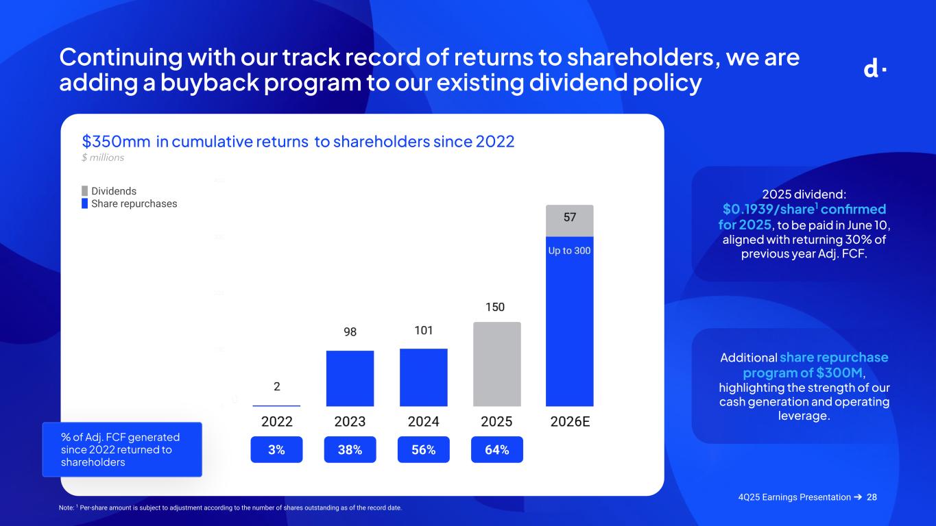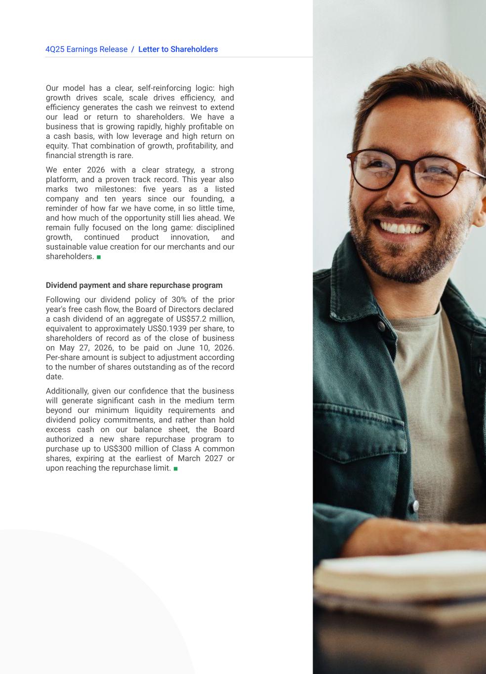 64Q25 Earnings Release / Letter to Shareholders Our model has a clear, self-reinforcing logic: high growth drives scale, scale drives efficiency, and efficiency generates the cash we reinvest to extend our lead or return to shareholders. We have a business that is growing rapidly, highly profitable on a cash basis, with low leverage and high return on equity. That combination of growth, profitability, and financial strength is rare. We enter 2026 with a clear strategy, a strong platform, and a proven track record. This year also marks two milestones: five years as a listed company and ten years since our founding, a reminder of how far we have come, in so little time, and how much of the opportunity still lies ahead. We remain fully focused on the long game: disciplined growth, continued product innovation, and sustainable value creation for our merchants and our shareholders. ■ Dividend payment and share repurchase program Following our dividend policy of 30% of the prior year's free cash flow, the Board of Directors declared a cash dividend of an aggregate of US$57.2 million, equivalent to approximately US$0.1939 per share, to shareholders of record as of the close of business on May 27, 2026, to be paid on June 10, 2026. Per-share amount is subject to adjustment according to the number of shares outstanding as of the record date. Additionally, given our confidence that the business will generate significant cash in the medium term beyond our minimum liquidity requirements and dividend policy commitments, and rather than hold excess cash on our balance sheet, the Board authorized a new share repurchase program to purchase up to US$300 million of Class A common shares, expiring at the earliest of March 2027 or upon reaching the repurchase limit. ■