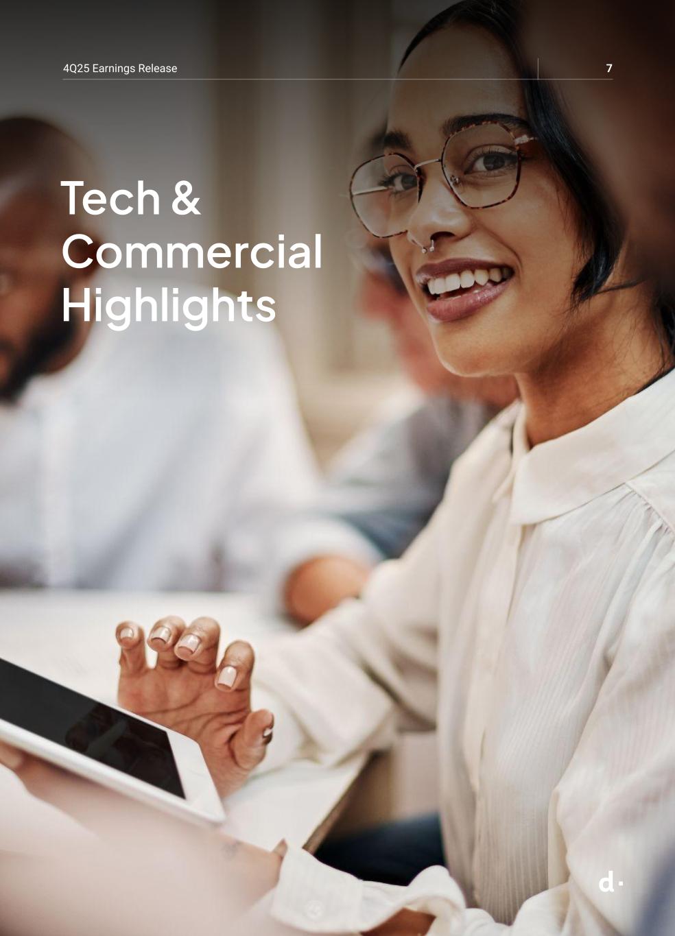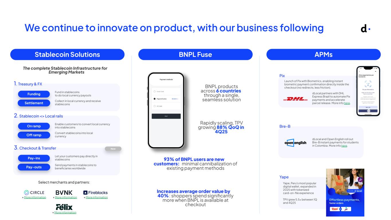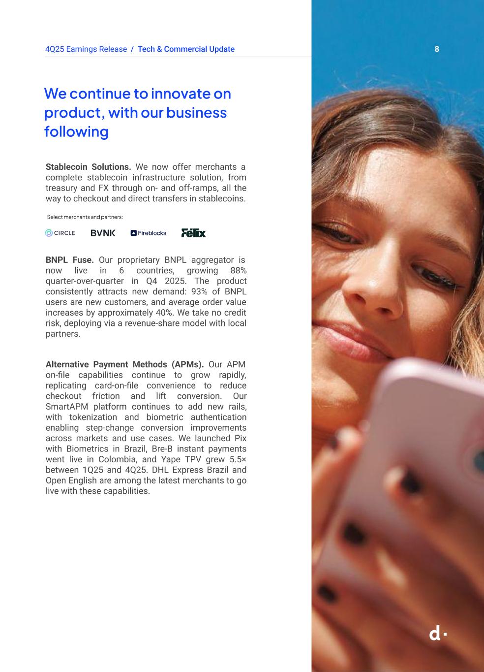 84Q25 Earnings Release Stablecoin Solutions. We now offer merchants a complete stablecoin infrastructure solution, from treasury and FX through on- and off-ramps, all the way to checkout and direct transfers in stablecoins. BNPL Fuse. Our proprietary BNPL aggregator is now live in 6 countries, growing 88% quarter-over-quarter in Q4 2025. The product consistently attracts new demand: 93% of BNPL users are new customers, and average order value increases by approximately 40%. We take no credit risk, deploying via a revenue-share model with local partners. Alternative Payment Methods (APMs). Our APM on-file capabilities continue to grow rapidly, replicating card-on-file convenience to reduce checkout friction and lift conversion. Our SmartAPM platform continues to add new rails, with tokenization and biometric authentication enabling step-change conversion improvements across markets and use cases. We launched Pix with Biometrics in Brazil, Bre-B instant payments went live in Colombia, and Yape TPV grew 5.5× between 1Q25 and 4Q25. DHL Express Brazil and Open English are among the latest merchants to go live with these capabilities. We continue to innovate on product, with our business following / Tech & Commercial Update Select merchants and partners: