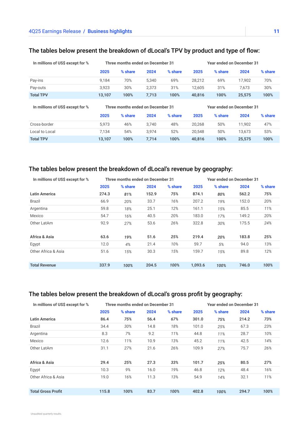 114Q25 Earnings Release The tables below present the breakdown of dLocal’s TPV by product and type of flow: The tables below present the breakdown of dLocal’s revenue by geography: The tables below present the breakdown of dLocal’s gross profit by geography: / Business highlights In millions of US$ except for % Three months ended on December 31 Year ended on December 31 2025 % share 2024 % share 2025 % share 2024 % share Latin America 86.4 75% 56.4 67% 301.0 75% 214.2 73% Brazil 34.4 30% 14.8 18% 101.0 25% 67.3 23% Argentina 8.3 7% 9.2 11% 44.8 11% 28.7 10% Mexico 12.6 11% 10.9 13% 45.2 11% 42.5 14% Other LatAm 31.1 27% 21.6 26% 109.9 27% 75.7 26% Africa & Asia 29.4 25% 27.3 33% 101.7 25% 80.5 27% Egypt 10.3 9% 16.0 19% 46.8 12% 48.4 16% Other Africa & Asia 19.0 16% 11.3 13% 54.9 14% 32.1 11% Total Gross Profit 115.8 100% 83.7 100% 402.8 100% 294.7 100% In millions of US$ except for % Three months ended on December 31 Year ended on December 31 2025 % share 2024 % share 2025 % share 2024 % share Latin America 274.3 81% 152.9 75% 874.1 80% 562.2 75% Brazil 66.9 20% 33.7 16% 207.2 19% 152.0 20% Argentina 59.8 18% 25.1 12% 161.1 15% 85.5 11% Mexico 54.7 16% 40.5 20% 183.0 17% 149.2 20% Other LatAm 92.9 27% 53.6 26% 322.8 30% 175.5 24% Africa & Asia 63.6 19% 51.6 25% 219.4 20% 183.8 25% Egypt 12.0 4% 21.4 10% 59.7 5% 94.0 13% Other Africa & Asia 51.6 15% 30.3 15% 159.7 15% 89.8 12% Total Revenue 337.9 100% 204.5 100% 1,093.6 100% 746.0 100% In millions of US$ except for % Three months ended on December 31 Year ended on December 31 2025 % share 2024 % share 2025 % share 2024 % share Cross-border 5,973 46% 3,740 48% 20,268 50% 11,902 47% Local to Local 7,134 54% 3,974 52% 20,548 50% 13,673 53% Total TPV 13,107 100% 7,714 100% 40,816 100% 25,575 100% In millions of US$ except for % Three months ended on December 31 Year ended on December 31 2025 % share 2024 % share 2025 % share 2024 % share Pay-ins 9,184 70% 5,340 69% 28,212 69% 17,902 70% Pay-outs 3,923 30% 2,373 31% 12,605 31% 7,673 30% Total TPV 13,107 100% 7,713 100% 40,816 100% 25,575 100% Unaudited quarterly results.