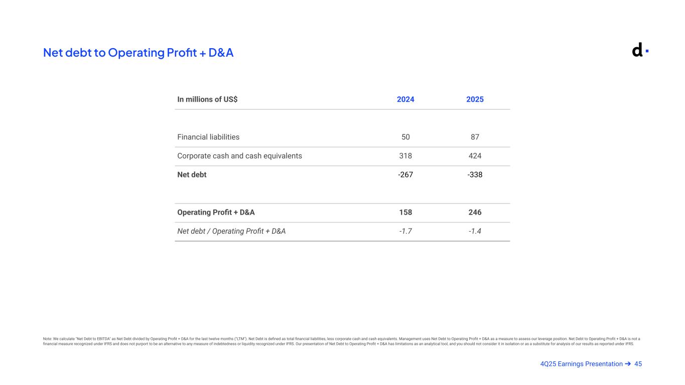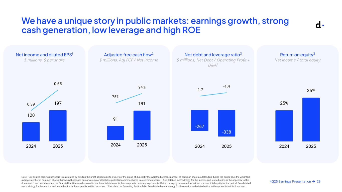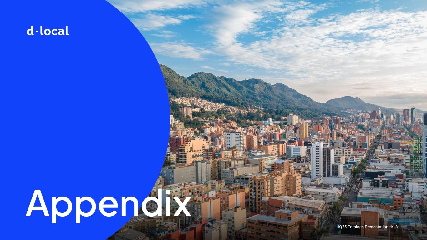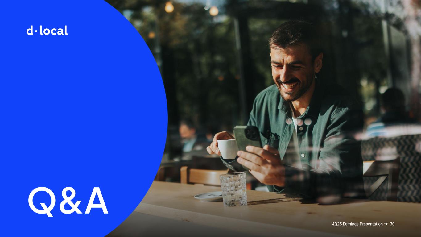 ●As of December 31, 2025, dLocal had US$719.9 million in cash and cash equivalents, which includes US$424.5 million of Corporate cash and cash equivalents. The Corporate cash and cash equivalents increased by US$106.7 million from US$317.8 million as of December 31, 2024. When compared to the US$333.1 million Corporate cash and cash equivalents position as of September 30, 2025, it increased by US$91.4 million quarter-over-quarter.