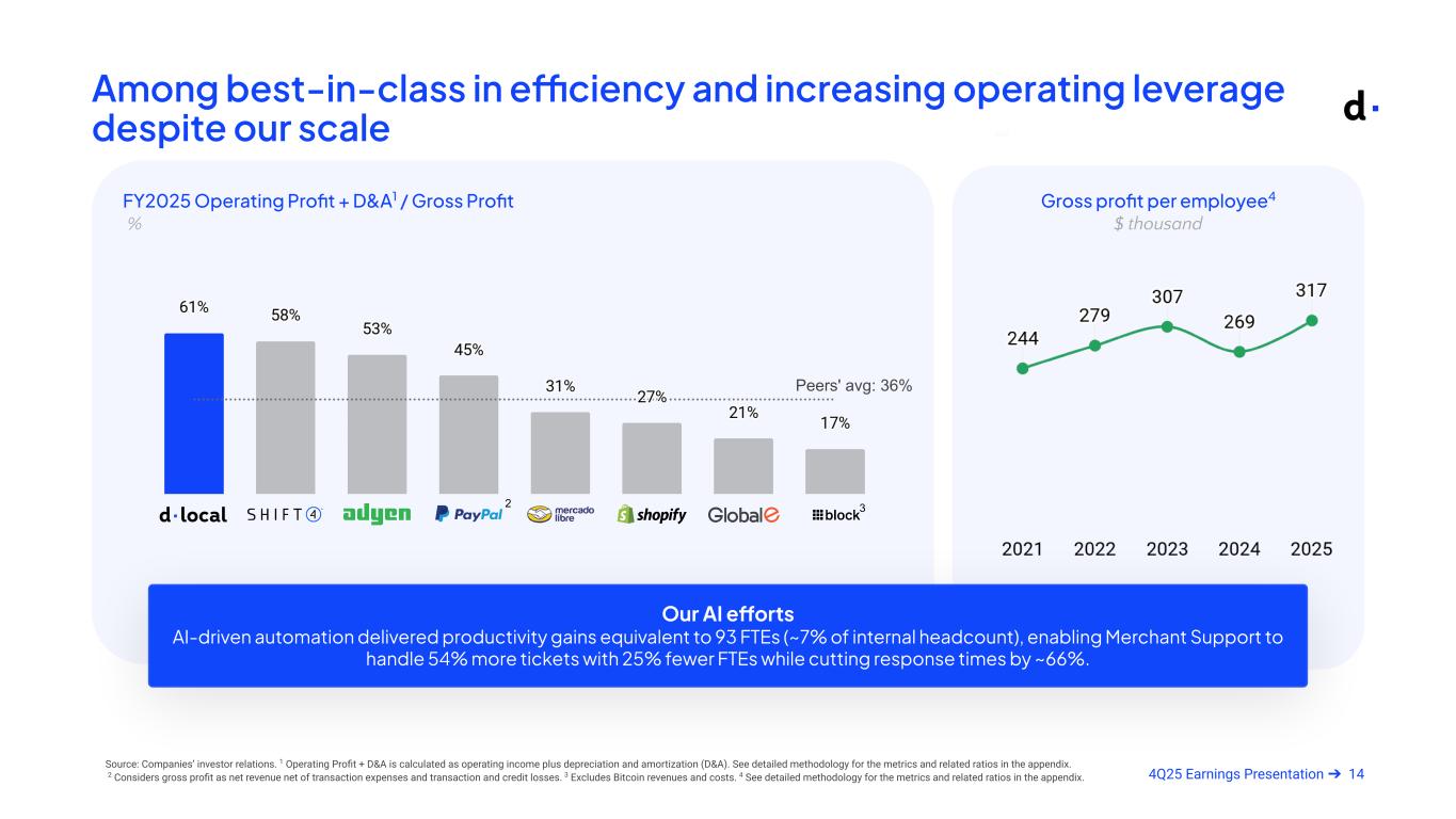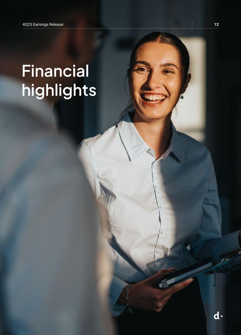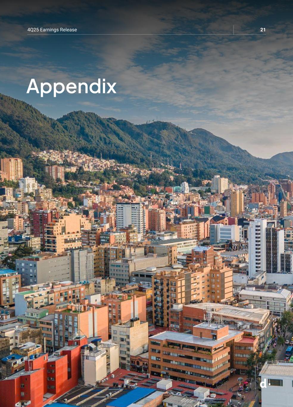 ●As of December 31, 2025, dLocal had US$719.9 million in cash and cash equivalents, which includes US$424.5 million of Corporate cash and cash equivalents. The Corporate cash and cash equivalents increased by US$106.7 million from US$317.8 million as of December 31, 2024. When compared to the US$333.1 million Corporate cash and cash equivalents position as of September 30, 2025, it increased by US$91.4 million quarter-over-quarter.