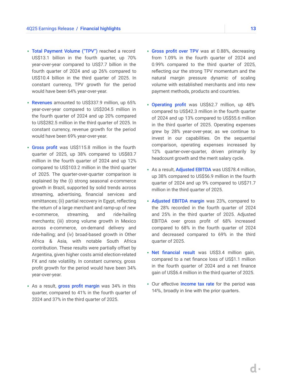 134Q25 Earnings Release / Financial highlights ▪ Total Payment Volume (“TPV”) reached a record US$13.1 billion in the fourth quarter, up 70% year-over-year compared to US$7.7 billion in the fourth quarter of 2024 and up 26% compared to US$10.4 billion in the third quarter of 2025. In constant currency, TPV growth for the period would have been 64% year-over-year. ▪ Revenues amounted to US$337.9 million, up 65% year-over-year compared to US$204.5 million in the fourth quarter of 2024 and up 20% compared to US$282.5 million in the third quarter of 2025. In constant currency, revenue growth for the period would have been 69% year-over-year. ▪ Gross profit was US$115.8 million in the fourth quarter of 2025, up 38% compared to US$83.7 million in the fourth quarter of 2024 and up 12% compared to US$103.2 million in the third quarter of 2025. The quarter-over-quarter comparison is explained by the (i) strong seasonal e-commerce growth in Brazil, supported by solid trends across streaming, advertising, financial services and remittances; (ii) partial recovery in Egypt, reflecting the return of a large merchant and ramp-up of new e-commerce, streaming, and ride-hailing merchants; (iii) strong volume growth in Mexico across e-commerce, on-demand delivery and ride-hailing; and (iv) broad-based growth in Other Africa & Asia, with notable South Africa contribution. These results were partially offset by Argentina, given higher costs amid election-related FX and rate volatility. In constant currency, gross profit growth for the period would have been 34% year-over-year. ▪ As a result, gross profit margin was 34% in this quarter, compared to 41% in the fourth quarter of 2024 and 37% in the third quarter of 2025. ▪ Gross profit over TPV was at 0.88%, decreasing from 1.09% in the fourth quarter of 2024 and 0.99% compared to the third quarter of 2025, reflecting our the strong TPV momentum and the natural margin pressure dynamic of scaling volume with established merchants and into new payment methods, products and countries. ▪ Operating profit was US$62.7 million, up 48% compared to US$42.3 million in the fourth quarter of 2024 and up 13% compared to US$55.6 million in the third quarter of 2025. Operating expenses grew by 28% year-over-year, as we continue to invest in our capabilities. On the sequential comparison, operating expenses increased by 12% quarter-over-quarter, driven primarily by headcount growth and the merit salary cycle. ▪ As a result, Adjusted EBITDA was US$78.4 million, up 38% compared to US$56.9 million in the fourth quarter of 2024 and up 9% compared to US$71.7 million in the third quarter of 2025. ▪ Adjusted EBITDA margin was 23%, compared to the 28% recorded in the fourth quarter of 2024 and 25% in the third quarter of 2025. Adjusted EBITDA over gross profit of 68% increased compared to 68% in the fourth quarter of 2024 and decreased compared to 69% in the third quarter of 2025. ▪ Net financial result was US$3.4 million gain, compared to a net finance loss of US$1.1 million in the fourth quarter of 2024 and a net finance gain of US$6.4 million in the third quarter of 2025. ▪ Our effective income tax rate for the period was 14%, broadly in line with the prior quarters.