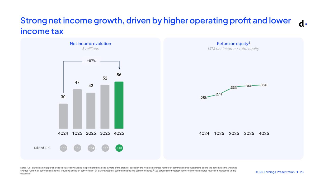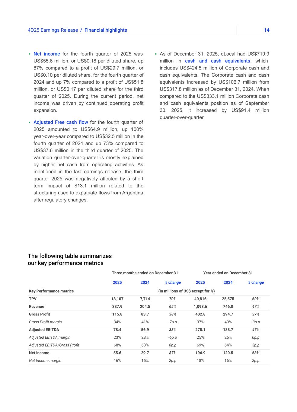 144Q25 Earnings Release The following table summarizes our key performance metrics ▪ Net income for the fourth quarter of 2025 was US$55.6 million, or US$0.18 per diluted share, up 87% compared to a profit of US$29.7 million, or US$0.10 per diluted share, for the fourth quarter of 2024 and up 7% compared to a profit of US$51.8 million, or US$0.17 per diluted share for the third quarter of 2025. During the current period, net income was driven by continued operating profit expansion. ▪ Adjusted Free cash flow for the fourth quarter of 2025 amounted to US$64.9 million, up 100% year-over-year compared to US$32.5 million in the fourth quarter of 2024 and up 73% compared to US$37.6 million in the third quarter of 2025. The variation quarter-over-quarter is mostly explained by higher net cash from operating activities. As mentioned in the last earnings release, the third quarter 2025 was negatively affected by a short term impact of $13.1 million related to the structuring used to expatriate flows from Argentina after regulatory changes. ▪ As of December 31, 2025, dLocal had US$719.9 million in cash and cash equivalents, which includes US$424.5 million of Corporate cash and cash equivalents. The Corporate cash and cash equivalents increased by US$106.7 million from US$317.8 million as of December 31, 2024. When compared to the US$333.1 million Corporate cash and cash equivalents position as of September 30, 2025, it increased by US$91.4 million quarter-over-quarter. / Financial highlights Three months ended on December 31 Year ended on December 31 2025 2024 % change 2025 2024 % change Key Performance metrics (In millions of US$ except for %) TPV 13,107 7,714 70% 40,816 25,575 60% Revenue 337.9 204.5 65% 1,093.6 746.0 47% Gross Profit 115.8 83.7 38% 402.8 294.7 37% Gross Profit margin 34% 41% -7p.p 37% 40% -3p.p Adjusted EBITDA 78.4 56.9 38% 278.1 188.7 47% Adjusted EBITDA margin 23% 28% -5p.p 25% 25% 0p.p Adjusted EBITDA/Gross Profit 68% 68% 0p.p 69% 64% 5p.p Net Income 55.6 29.7 87% 196.9 120.5 63% Net Income margin 16% 15% 2p.p 18% 16% 2p.p
