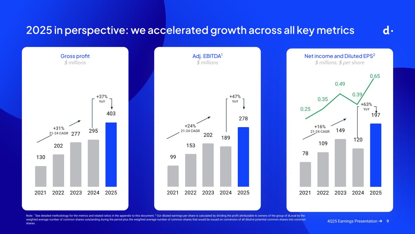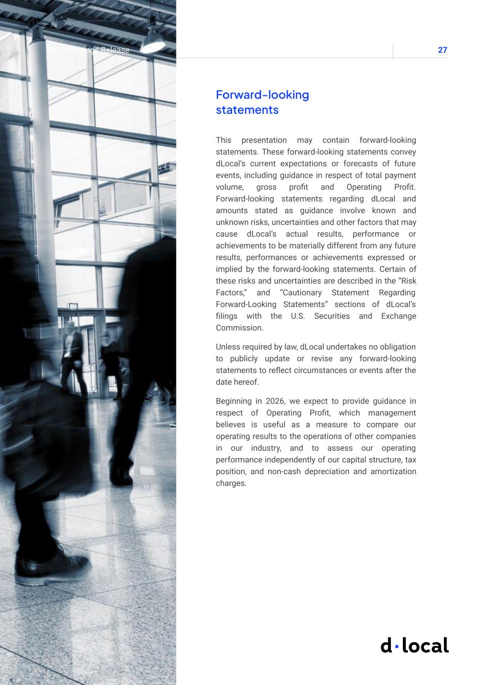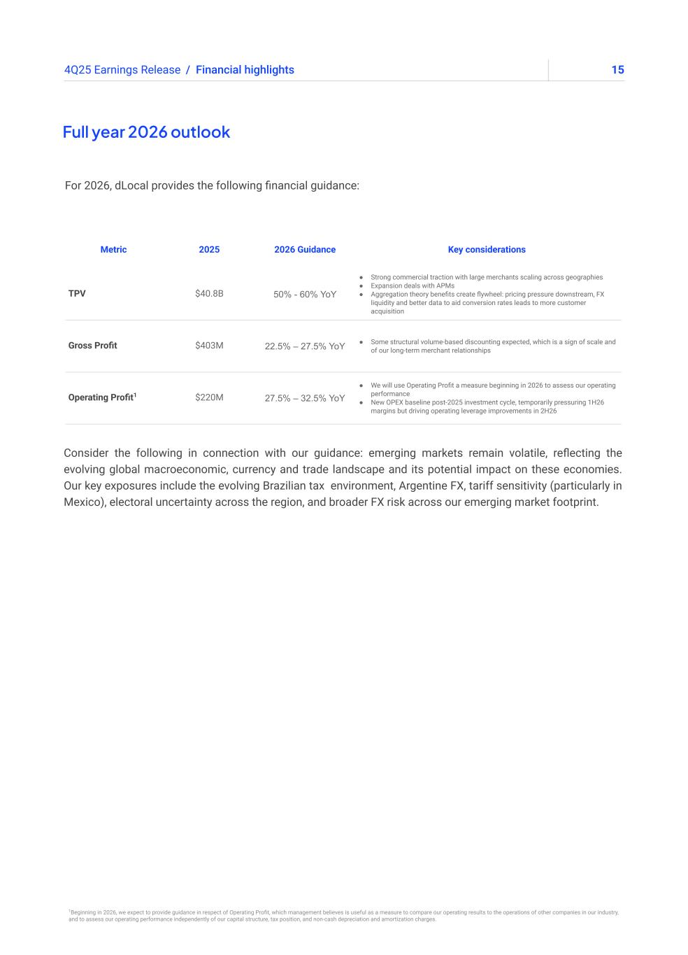 154Q25 Earnings Release / Financial highlights Full year 2026 outlook Metric 2025 2026 Guidance Key considerations TPV $40.8B 50% - 60% YoY ● Strong commercial traction with large merchants scaling across geographies ● Expansion deals with APMs ● Aggregation theory benefits create flywheel: pricing pressure downstream, FX liquidity and better data to aid conversion rates leads to more customer acquisition Gross Profit $403M 22.5% – 27.5% YoY ● Some structural volume-based discounting expected, which is a sign of scale and of our long-term merchant relationships Operating Profit1 $220M 27.5% – 32.5% YoY ● We will use Operating Profit a measure beginning in 2026 to assess our operating performance ● New OPEX baseline post-2025 investment cycle, temporarily pressuring 1H26 margins but driving operating leverage improvements in 2H26 For 2026, dLocal provides the following financial guidance: Consider the following in connection with our guidance: emerging markets remain volatile, reflecting the evolving global macroeconomic, currency and trade landscape and its potential impact on these economies. Our key exposures include the evolving Brazilian tax environment, Argentine FX, tariff sensitivity (particularly in Mexico), electoral uncertainty across the region, and broader FX risk across our emerging market footprint. 1Beginning in 2026, we expect to provide guidance in respect of Operating Profit, which management believes is useful as a measure to compare our operating results to the operations of other companies in our industry, and to assess our operating performance independently of our capital structure, tax position, and non-cash depreciation and amortization charges.