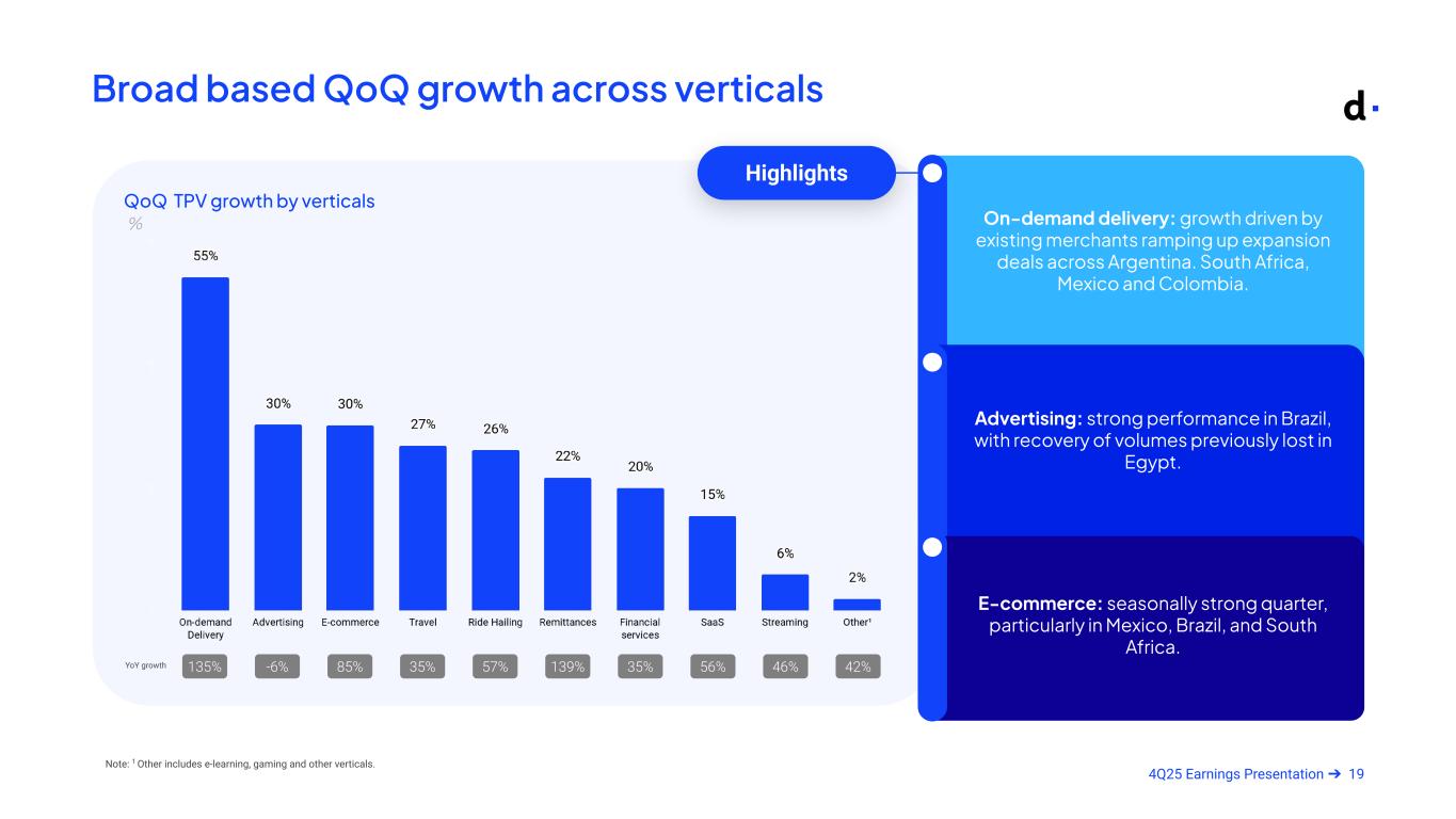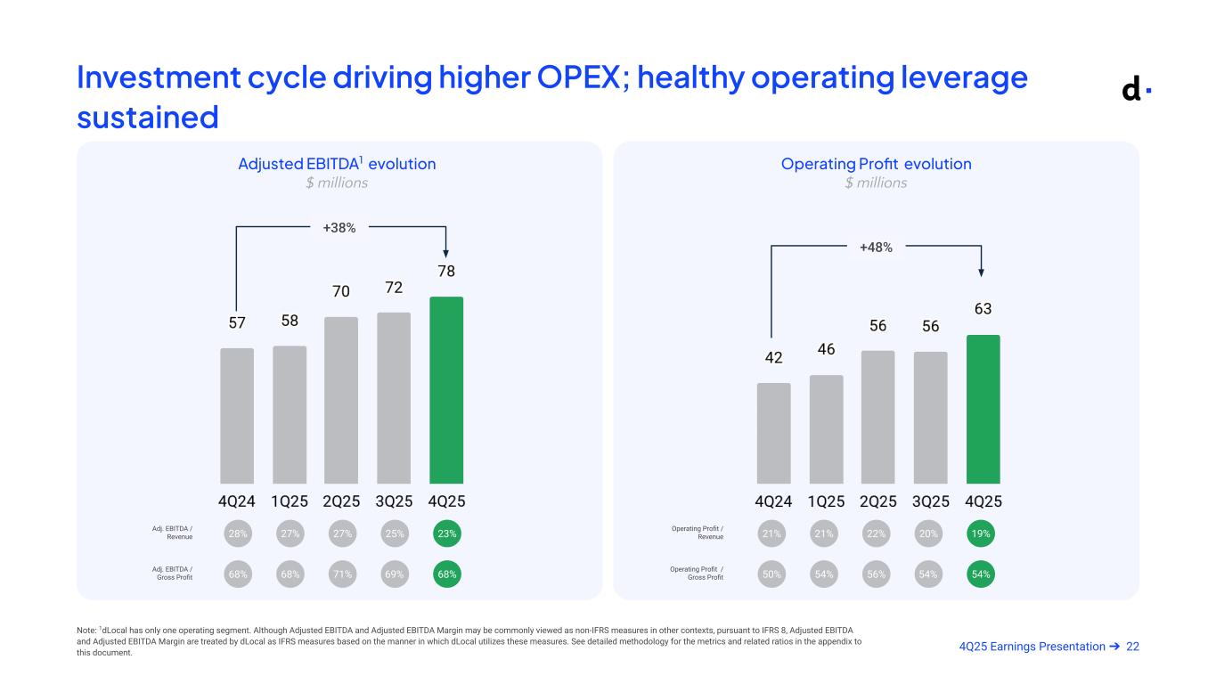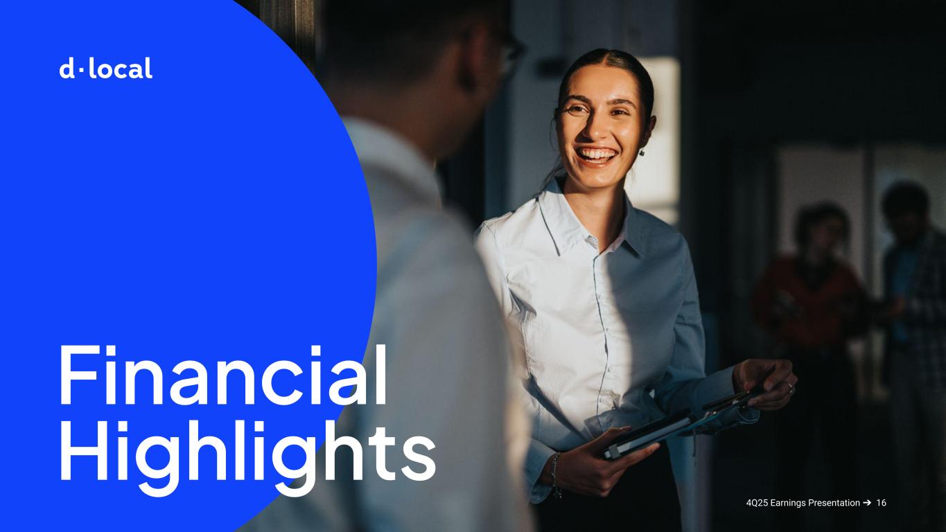 154Q25 Earnings Release / Financial highlights Full year 2026 outlook Metric 2025 2026 Guidance Key considerations TPV $40.8B 50% - 60% YoY ● Strong commercial traction with large merchants scaling across geographies ● Expansion deals with APMs ● Aggregation theory benefits create flywheel: pricing pressure downstream, FX liquidity and better data to aid conversion rates leads to more customer acquisition Gross Profit $403M 22.5% – 27.5% YoY ● Some structural volume-based discounting expected, which is a sign of scale and of our long-term merchant relationships Operating Profit1 $220M 27.5% – 32.5% YoY ● We will use Operating Profit a measure beginning in 2026 to assess our operating performance ● New OPEX baseline post-2025 investment cycle, temporarily pressuring 1H26 margins but driving operating leverage improvements in 2H26 For 2026, dLocal provides the following financial guidance: Consider the following in connection with our guidance: emerging markets remain volatile, reflecting the evolving global macroeconomic, currency and trade landscape and its potential impact on these economies. Our key exposures include the evolving Brazilian tax environment, Argentine FX, tariff sensitivity (particularly in Mexico), electoral uncertainty across the region, and broader FX risk across our emerging market footprint. 1Beginning in 2026, we expect to provide guidance in respect of Operating Profit, which management believes is useful as a measure to compare our operating results to the operations of other companies in our industry, and to assess our operating performance independently of our capital structure, tax position, and non-cash depreciation and amortization charges.