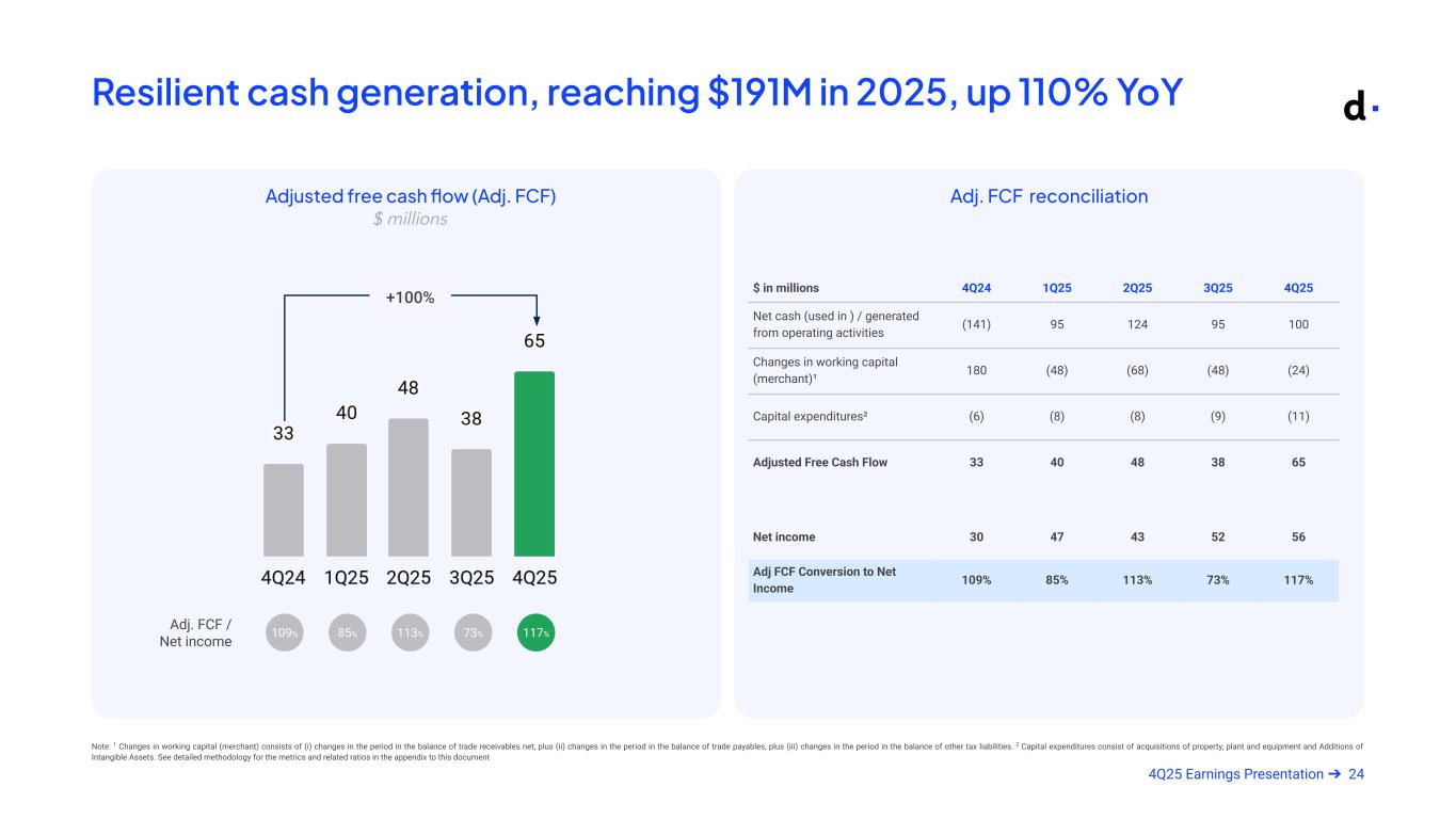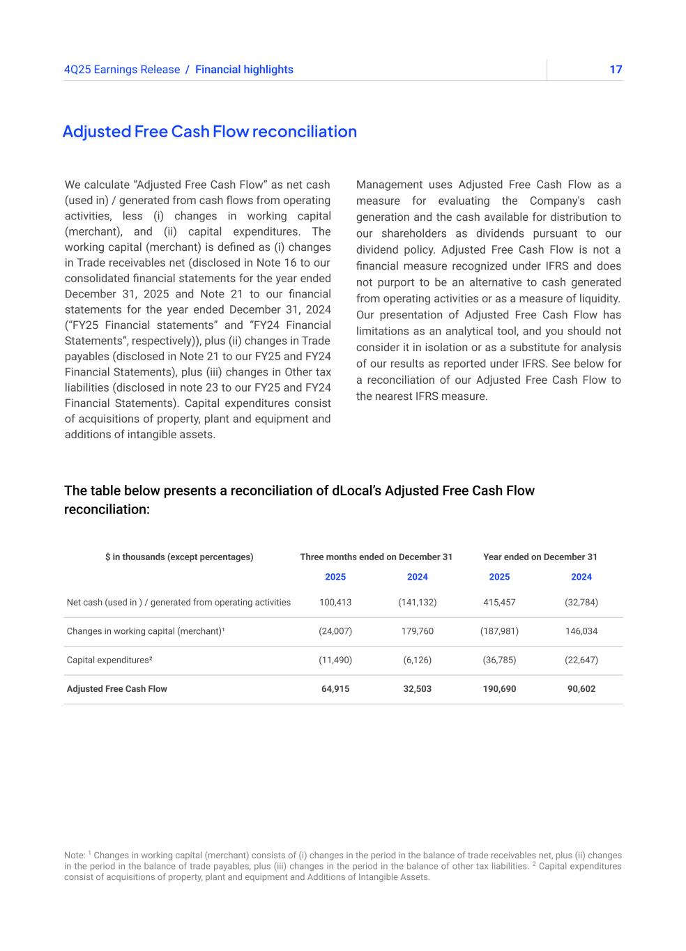 174Q25 Earnings Release Adjusted Free Cash Flow reconciliation We calculate “Adjusted Free Cash Flow” as net cash (used in) / generated from cash flows from operating activities, less (i) changes in working capital (merchant), and (ii) capital expenditures. The working capital (merchant) is defined as (i) changes in Trade receivables net (disclosed in Note 16 to our consolidated financial statements for the year ended December 31, 2025 and Note 21 to our financial statements for the year ended December 31, 2024 (“FY25 Financial statements” and “FY24 Financial Statements”, respectively)), plus (ii) changes in Trade payables (disclosed in Note 21 to our FY25 and FY24 Financial Statements), plus (iii) changes in Other tax liabilities (disclosed in note 23 to our FY25 and FY24 Financial Statements). Capital expenditures consist of acquisitions of property, plant and equipment and additions of intangible assets. Management uses Adjusted Free Cash Flow as a measure for evaluating the Company's cash generation and the cash available for distribution to our shareholders as dividends pursuant to our dividend policy. Adjusted Free Cash Flow is not a financial measure recognized under IFRS and does not purport to be an alternative to cash generated from operating activities or as a measure of liquidity. Our presentation of Adjusted Free Cash Flow has limitations as an analytical tool, and you should not consider it in isolation or as a substitute for analysis of our results as reported under IFRS. See below for a reconciliation of our Adjusted Free Cash Flow to the nearest IFRS measure. / Financial highlights The table below presents a reconciliation of dLocal’s Adjusted Free Cash Flow reconciliation: $ in thousands (except percentages) Three months ended on December 31 Year ended on December 31 2025 2024 2025 2024 Net cash (used in ) / generated from operating activities 100,413 (141,132) 415,457 (32,784) Changes in working capital (merchant)¹ (24,007) 179,760 (187,981) 146,034 Capital expenditures² (11,490) (6,126) (36,785) (22,647) Adjusted Free Cash Flow 64,915 32,503 190,690 90,602 Note: 1 Changes in working capital (merchant) consists of (i) changes in the period in the balance of trade receivables net, plus (ii) changes in the period in the balance of trade payables, plus (iii) changes in the period in the balance of other tax liabilities. 2 Capital expenditures consist of acquisitions of property, plant and equipment and Additions of Intangible Assets.