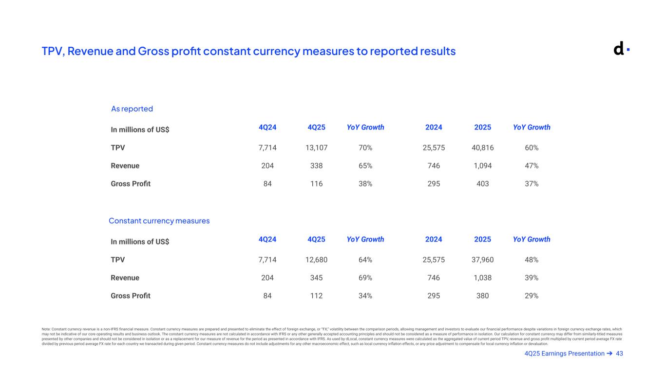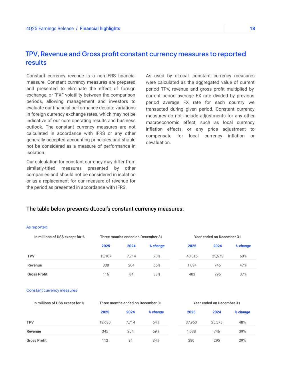 184Q25 Earnings Release The table below presents dLocal’s constant currency measures: TPV, Revenue and Gross profit constant currency measures to reported results Constant currency revenue is a non-IFRS financial measure. Constant currency measures are prepared and presented to eliminate the effect of foreign exchange, or “FX,” volatility between the comparison periods, allowing management and investors to evaluate our financial performance despite variations in foreign currency exchange rates, which may not be indicative of our core operating results and business outlook. The constant currency measures are not calculated in accordance with IFRS or any other generally accepted accounting principles and should not be considered as a measure of performance in isolation. Our calculation for constant currency may differ from similarly-titled measures presented by other companies and should not be considered in isolation or as a replacement for our measure of revenue for the period as presented in accordance with IFRS. As used by dLocal, constant currency measures were calculated as the aggregated value of current period TPV, revenue and gross profit multiplied by current period average FX rate divided by previous period average FX rate for each country we transacted during given period. Constant currency measures do not include adjustments for any other macroeconomic effect, such as local currency inflation effects, or any price adjustment to compensate for local currency inflation or devaluation. / Financial highlights As reported Constant currency measures In millions of US$ except for % Three months ended on December 31 Year ended on December 31 2025 2024 % change 2025 2024 % change TPV 13,107 7,714 70% 40,816 25,575 60% Revenue 338 204 65% 1,094 746 47% Gross Profit 116 84 38% 403 295 37% In millions of US$ except for % Three months ended on December 31 Year ended on December 31 2025 2024 % change 2025 2024 % change TPV 12,680 7,714 64% 37,960 25,575 48% Revenue 345 204 69% 1,038 746 39% Gross Profit 112 84 34% 380 295 29%