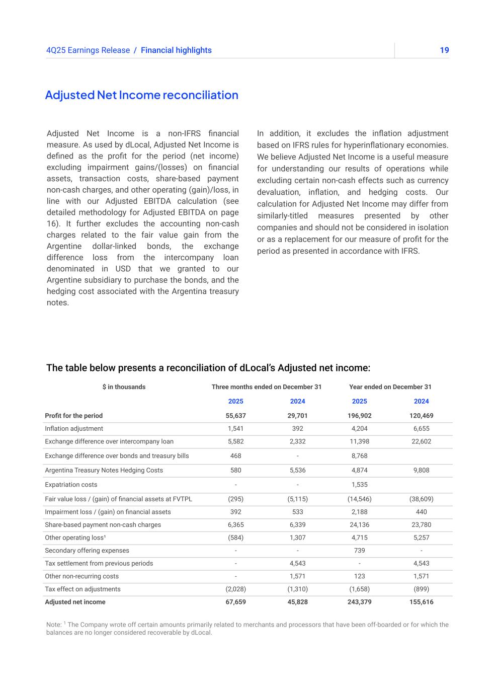 194Q25 Earnings Release The table below presents a reconciliation of dLocal’s Adjusted net income: Note: 1 The Company wrote off certain amounts primarily related to merchants and processors that have been off-boarded or for which the balances are no longer considered recoverable by dLocal. Adjusted Net Income reconciliation Adjusted Net Income is a non-IFRS financial measure. As used by dLocal, Adjusted Net Income is defined as the profit for the period (net income) excluding impairment gains/(losses) on financial assets, transaction costs, share-based payment non-cash charges, and other operating (gain)/loss, in line with our Adjusted EBITDA calculation (see detailed methodology for Adjusted EBITDA on page 16). It further excludes the accounting non-cash charges related to the fair value gain from the Argentine dollar-linked bonds, the exchange difference loss from the intercompany loan denominated in USD that we granted to our Argentine subsidiary to purchase the bonds, and the hedging cost associated with the Argentina treasury notes. In addition, it excludes the inflation adjustment based on IFRS rules for hyperinflationary economies. We believe Adjusted Net Income is a useful measure for understanding our results of operations while excluding certain non-cash effects such as currency devaluation, inflation, and hedging costs. Our calculation for Adjusted Net Income may differ from similarly-titled measures presented by other companies and should not be considered in isolation or as a replacement for our measure of profit for the period as presented in accordance with IFRS. / Financial highlights $ in thousands Three months ended on December 31 Year ended on December 31 2025 2024 2025 2024 Profit for the period 55,637 29,701 196,902 120,469 Inflation adjustment 1,541 392 4,204 6,655 Exchange difference over intercompany loan 5,582 2,332 11,398 22,602 Exchange difference over bonds and treasury bills 468 - 8,768 Argentina Treasury Notes Hedging Costs 580 5,536 4,874 9,808 Expatriation costs - - 1,535 Fair value loss / (gain) of financial assets at FVTPL (295) (5,115) (14,546) (38,609) Impairment loss / (gain) on financial assets 392 533 2,188 440 Share-based payment non-cash charges 6,365 6,339 24,136 23,780 Other operating loss¹ (584) 1,307 4,715 5,257 Secondary offering expenses - - 739 - Tax settlement from previous periods - 4,543 - 4,543 Other non-recurring costs - 1,571 123 1,571 Tax effect on adjustments (2,028) (1,310) (1,658) (899) Adjusted net income 67,659 45,828 243,379 155,616