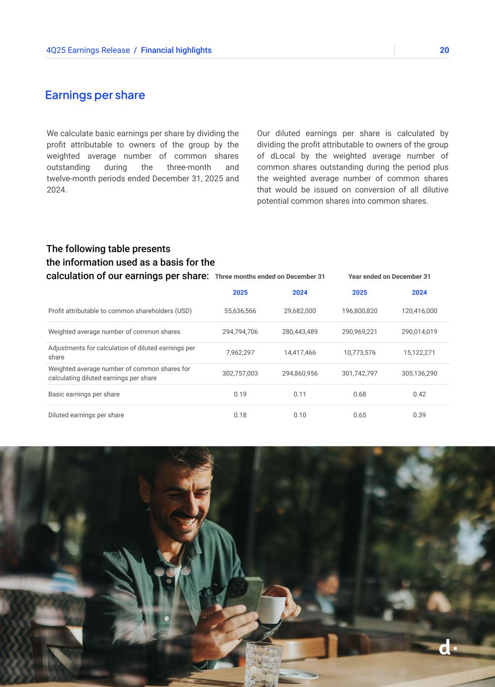 204Q25 Earnings Release Earnings per share We calculate basic earnings per share by dividing the profit attributable to owners of the group by the weighted average number of common shares outstanding during the three-month and twelve-month periods ended December 31, 2025 and 2024. Our diluted earnings per share is calculated by dividing the profit attributable to owners of the group of dLocal by the weighted average number of common shares outstanding during the period plus the weighted average number of common shares that would be issued on conversion of all dilutive potential common shares into common shares. / Financial highlights Three months ended on December 31 Year ended on December 31 2025 2024 2025 2024 Profit attributable to common shareholders (USD) 55,636,566 29,682,000 196,800,820 120,416,000 Weighted average number of common shares 294,794,706 280,443,489 290,969,221 290,014,019 Adjustments for calculation of diluted earnings per share 7,962,297 14,417,466 10,773,576 15,122,271 Weighted average number of common shares for calculating diluted earnings per share 302,757,003 294,860,956 301,742,797 305,136,290 Basic earnings per share 0.19 0.11 0.68 0.42 Diluted earnings per share 0.18 0.10 0.65 0.39 The following table presents the information used as a basis for the calculation of our earnings per share: