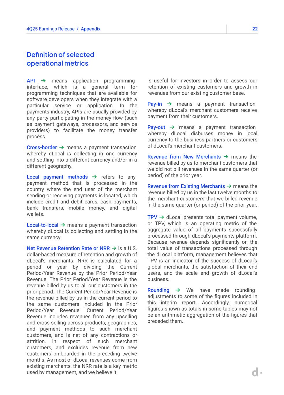 224Q25 Earnings Release Definition of selected operational metrics API ➔ means application programming interface, which is a general term for programming techniques that are available for software developers when they integrate with a particular service or application. In the payments industry, APIs are usually provided by any party participating in the money flow (such as payment gateways, processors, and service providers) to facilitate the money transfer process. Cross-border ➔ means a payment transaction whereby dLocal is collecting in one currency and settling into a different currency and/or in a different geography. Local payment methods ➔ refers to any payment method that is processed in the country where the end user of the merchant sending or receiving payments is located, which include credit and debit cards, cash payments, bank transfers, mobile money, and digital wallets. Local-to-local ➔ means a payment transaction whereby dLocal is collecting and settling in the same currency. Net Revenue Retention Rate or NRR ➔ is a U.S. dollar-based measure of retention and growth of dLocal’s merchants. NRR is calculated for a period or year by dividing the Current Period/Year Revenue by the Prior Period/Year Revenue. The Prior Period/Year Revenue is the revenue billed by us to all our customers in the prior period. The Current Period/Year Revenue is the revenue billed by us in the current period to the same customers included in the Prior Period/Year Revenue. Current Period/Year Revenue includes revenues from any upselling and cross-selling across products, geographies, and payment methods to such merchant customers, and is net of any contractions or attrition, in respect of such merchant customers, and excludes revenue from new customers on-boarded in the preceding twelve months. As most of dLocal revenues come from existing merchants, the NRR rate is a key metric used by management, and we believe it is useful for investors in order to assess our retention of existing customers and growth in revenues from our existing customer base. Pay-in ➔ means a payment transaction whereby dLocal’s merchant customers receive payment from their customers. Pay-out ➔ means a payment transaction whereby dLocal disburses money in local currency to the business partners or customers of dLocal’s merchant customers. Revenue from New Merchants ➔ means the revenue billed by us to merchant customers that we did not bill revenues in the same quarter (or period) of the prior year. Revenue from Existing Merchants ➔ means the revenue billed by us in the last twelve months to the merchant customers that we billed revenue in the same quarter (or period) of the prior year. TPV ➔ dLocal presents total payment volume, or TPV, which is an operating metric of the aggregate value of all payments successfully processed through dLocal’s payments platform. Because revenue depends significantly on the total value of transactions processed through the dLocal platform, management believes that TPV is an indicator of the success of dLocal’s global merchants, the satisfaction of their end users, and the scale and growth of dLocal’s business. Rounding ➔ We have made rounding adjustments to some of the figures included in this interim report. Accordingly, numerical figures shown as totals in some tables may not be an arithmetic aggregation of the figures that preceded them. / Appendix