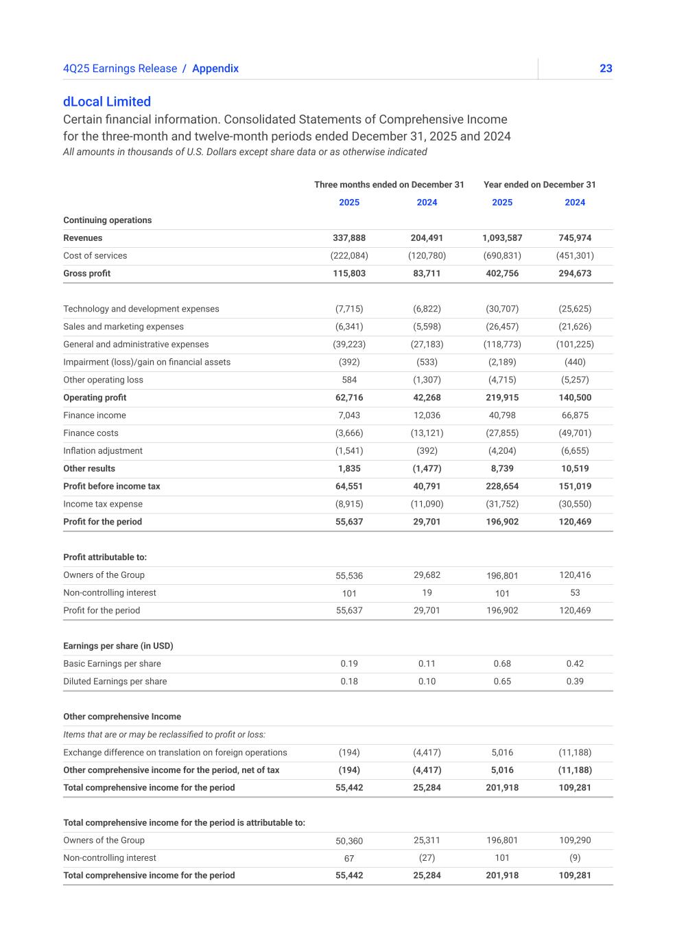 234Q25 Earnings Release / Appendix dLocal Limited Certain financial information. Consolidated Statements of Comprehensive Income for the three-month and twelve-month periods ended December 31, 2025 and 2024 All amounts in thousands of U.S. Dollars except share data or as otherwise indicated Three months ended on December 31 Year ended on December 31 2025 2024 2025 2024 Continuing operations Revenues 337,888 204,491 1,093,587 745,974 Cost of services (222,084) (120,780) (690,831) (451,301) Gross profit 115,803 83,711 402,756 294,673 Technology and development expenses (7,715) (6,822) (30,707) (25,625) Sales and marketing expenses (6,341) (5,598) (26,457) (21,626) General and administrative expenses (39,223) (27,183) (118,773) (101,225) Impairment (loss)/gain on financial assets (392) (533) (2,189) (440) Other operating loss 584 (1,307) (4,715) (5,257) Operating profit 62,716 42,268 219,915 140,500 Finance income 7,043 12,036 40,798 66,875 Finance costs (3,666) (13,121) (27,855) (49,701) Inflation adjustment (1,541) (392) (4,204) (6,655) Other results 1,835 (1,477) 8,739 10,519 Profit before income tax 64,551 40,791 228,654 151,019 Income tax expense (8,915) (11,090) (31,752) (30,550) Profit for the period 55,637 29,701 196,902 120,469 Profit attributable to: Owners of the Group 55,536 29,682 196,801 120,416 Non-controlling interest 101 19 101 53 Profit for the period 55,637 29,701 196,902 120,469 Earnings per share (in USD) Basic Earnings per share 0.19 0.11 0.68 0.42 Diluted Earnings per share 0.18 0.10 0.65 0.39 Other comprehensive Income Items that are or may be reclassified to profit or loss: Exchange difference on translation on foreign operations (194) (4,417) 5,016 (11,188) Other comprehensive income for the period, net of tax (194) (4,417) 5,016 (11,188) Total comprehensive income for the period 55,442 25,284 201,918 109,281 Total comprehensive income for the period is attributable to: Owners of the Group 50,360 25,311 196,801 109,290 Non-controlling interest 67 (27) 101 (9) Total comprehensive income for the period 55,442 25,284 201,918 109,281