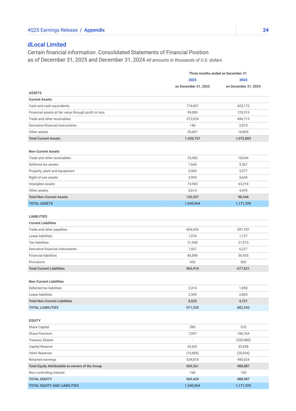 244Q25 Earnings Release / Appendix dLocal Limited Certain financial information. Consolidated Statements of Financial Position as of December 31, 2025 and December 31, 2024 All amounts in thousands of U.S. dollars Three months ended on December 31 2025 2024 on December 31, 2025 on December 31, 2024 ASSETS Current Assets Cash and cash equivalents 719,897 425,172 Financial assets at fair value through profit or loss 99,089 129,319 Trade and other receivables 572,024 496,713 Derivative financial instruments 140 2,874 Other assets 29,607 18,805 Total Current Assets 1,420,757 1,072,883 Non-Current Assets Trade and other receivables 25,982 18,044 Deferred tax assets 7,666 5,367 Property, plant and equipment 3,985 3,377 Right-of-use assets 2,995 3,645 Intangible assets 73,965 63,318 Other assets 5,614 4,695 Total Non-Current Assets 120,207 98,446 TOTAL ASSETS 1,540,964 1,171,329 LIABILITIES Current Liabilities Trade and other payables 854,436 597,787 Lease liabilities 1,076 1,137 Tax liabilities 21,500 21,515 Derivative financial instruments 1,567 6,227 Financial liabilities 86,898 50,455 Provisions 433 500 Total Current Liabilities 965,910 677,621 Non-Current Liabilities Deferred tax liabilities 3,316 1,858 Lease liabilities 2,309 2,863 Total Non-Current Liabilities 5,625 4,721 TOTAL LIABILITIES 971,535 682,342 EQUITY Share Capital 590 570 Share Premium 7,097 186,769 Treasury Shares - (200,980) Capital Reserve 42,641 33,438 Other Reserves (15,885) (20,934) Retained earnings 534,818 490,024 Total Equity Attributable to owners of the Group 569,261 488,887 Non-controlling interest 168 100 TOTAL EQUITY 569,429 488,987 TOTAL EQUITY AND LIABILITIES 1,540,964 1,171,329
