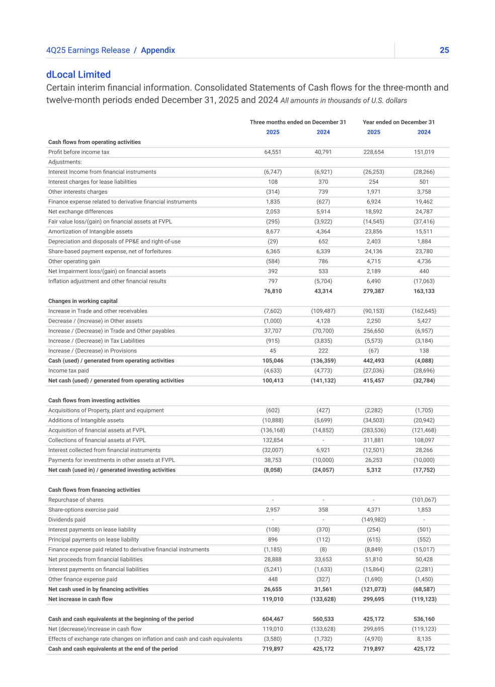 254Q25 Earnings Release / Appendix dLocal Limited Certain interim financial information. Consolidated Statements of Cash flows for the three-month and twelve-month periods ended December 31, 2025 and 2024 All amounts in thousands of U.S. dollars Three months ended on December 31 Year ended on December 31 2025 2024 2025 2024 Cash flows from operating activities Profit before income tax 64,551 40,791 228,654 151,019 Adjustments: Interest Income from financial instruments (6,747) (6,921) (26,253) (28,266) Interest charges for lease liabilities 108 370 254 501 Other interests charges (314) 739 1,971 3,758 Finance expense related to derivative financial instruments 1,835 (627) 6,924 19,462 Net exchange differences 2,053 5,914 18,592 24,787 Fair value loss/(gain) on financial assets at FVPL (295) (3,922) (14,545) (37,416) Amortization of Intangible assets 8,677 4,364 23,856 15,511 Depreciation and disposals of PP&E and right-of-use (29) 652 2,403 1,884 Share-based payment expense, net of forfeitures 6,365 6,339 24,136 23,780 Other operating gain (584) 786 4,715 4,736 Net Impairment loss/(gain) on financial assets 392 533 2,189 440 Inflation adjustment and other financial results 797 (5,704) 6,490 (17,063) 76,810 43,314 279,387 163,133 Changes in working capital Increase in Trade and other receivables (7,602) (109,487) (90,153) (162,645) Decrease / (Increase) in Other assets (1,000) 4,128 2,250 5,427 Increase / (Decrease) in Trade and Other payables 37,707 (70,700) 256,650 (6,957) Increase / (Decrease) in Tax Liabilities (915) (3,835) (5,573) (3,184) Increase / (Decrease) in Provisions 45 222 (67) 138 Cash (used) / generated from operating activities 105,046 (136,359) 442,493 (4,088) Income tax paid (4,633) (4,773) (27,036) (28,696) Net cash (used) / generated from operating activities 100,413 (141,132) 415,457 (32,784) Cash flows from investing activities Acquisitions of Property, plant and equipment (602) (427) (2,282) (1,705) Additions of Intangible assets (10,888) (5,699) (34,503) (20,942) Acquisition of financial assets at FVPL (136,168) (14,852) (283,536) (121,468) Collections of financial assets at FVPL 132,854 - 311,881 108,097 Interest collected from financial instruments (32,007) 6,921 (12,501) 28,266 Payments for investments in other assets at FVPL 38,753 (10,000) 26,253 (10,000) Net cash (used in) / generated investing activities (8,058) (24,057) 5,312 (17,752) Cash flows from financing activities Repurchase of shares - - - (101,067) Share-options exercise paid 2,957 358 4,371 1,853 Dividends paid - - (149,982) - Interest payments on lease liability (108) (370) (254) (501) Principal payments on lease liability 896 (112) (615) (552) Finance expense paid related to derivative financial instruments (1,185) (8) (8,849) (15,017) Net proceeds from financial liabilities 28,888 33,653 51,810 50,428 Interest payments on financial liabilities (5,241) (1,633) (15,864) (2,281) Other finance expense paid 448 (327) (1,690) (1,450) Net cash used in by financing activities 26,655 31,561 (121,073) (68,587) Net increase in cash flow 119,010 (133,628) 299,695 (119,123) Cash and cash equivalents at the beginning of the period 604,467 560,533 425,172 536,160 Net (decrease)/increase in cash flow 119,010 (133,628) 299,695 (119,123) Effects of exchange rate changes on inflation and cash and cash equivalents (3,580) (1,732) (4,970) 8,135 Cash and cash equivalents at the end of the period 719,897 425,172 719,897 425,172