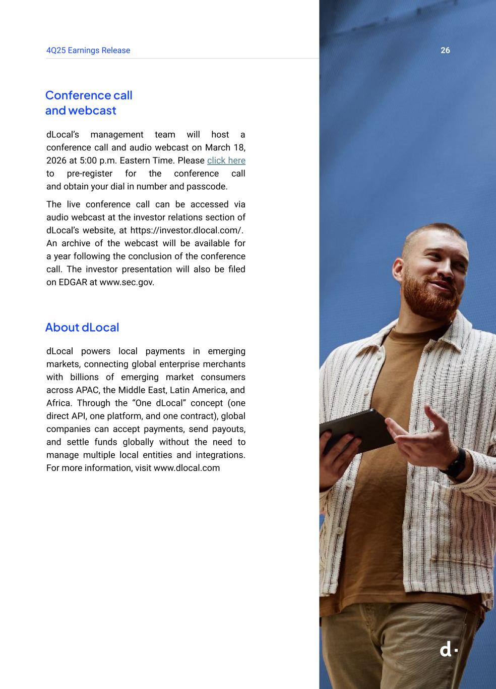 264Q25 Earnings Release dLocal powers local payments in emerging markets, connecting global enterprise merchants with billions of emerging market consumers across APAC, the Middle East, Latin America, and Africa. Through the “One dLocal” concept (one direct API, one platform, and one contract), global companies can accept payments, send payouts, and settle funds globally without the need to manage multiple local entities and integrations. For more information, visit www.dlocal.com Conference call and webcast About dLocal dLocal’s management team will host a conference call and audio webcast on March 18, 2026 at 5:00 p.m. Eastern Time. Please click here to pre-register for the conference call and obtain your dial in number and passcode. The live conference call can be accessed via audio webcast at the investor relations section of dLocal’s website, at https://investor.dlocal.com/. An archive of the webcast will be available for a year following the conclusion of the conference call. The investor presentation will also be filed on EDGAR at www.sec.gov.