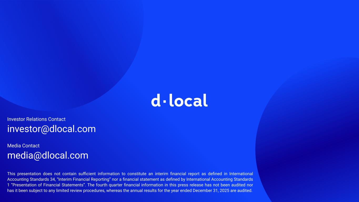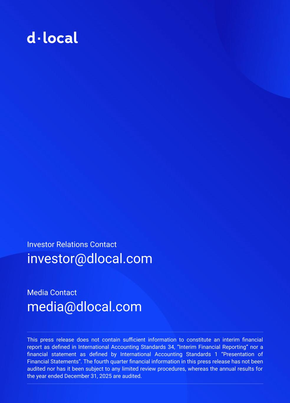 Investor Relations Contact investor@dlocal.com Media Contact media@dlocal.com This presentation does not contain sufficient information to constitute an interim financial report as defined in International Accounting Standards 34, “Interim Financial Reporting” nor a financial statement as defined by International Accounting Standards 1 “Presentation of Financial Statements”. The fourth quarter financial information in this press release has not been audited nor has it been subject to any limited review procedures, whereas the annual results for the year ended December 31, 2025 are audited.