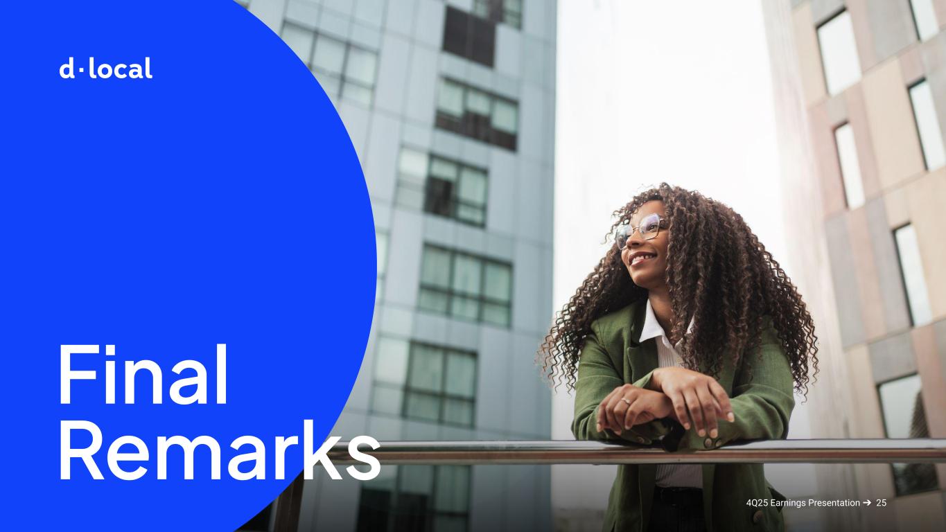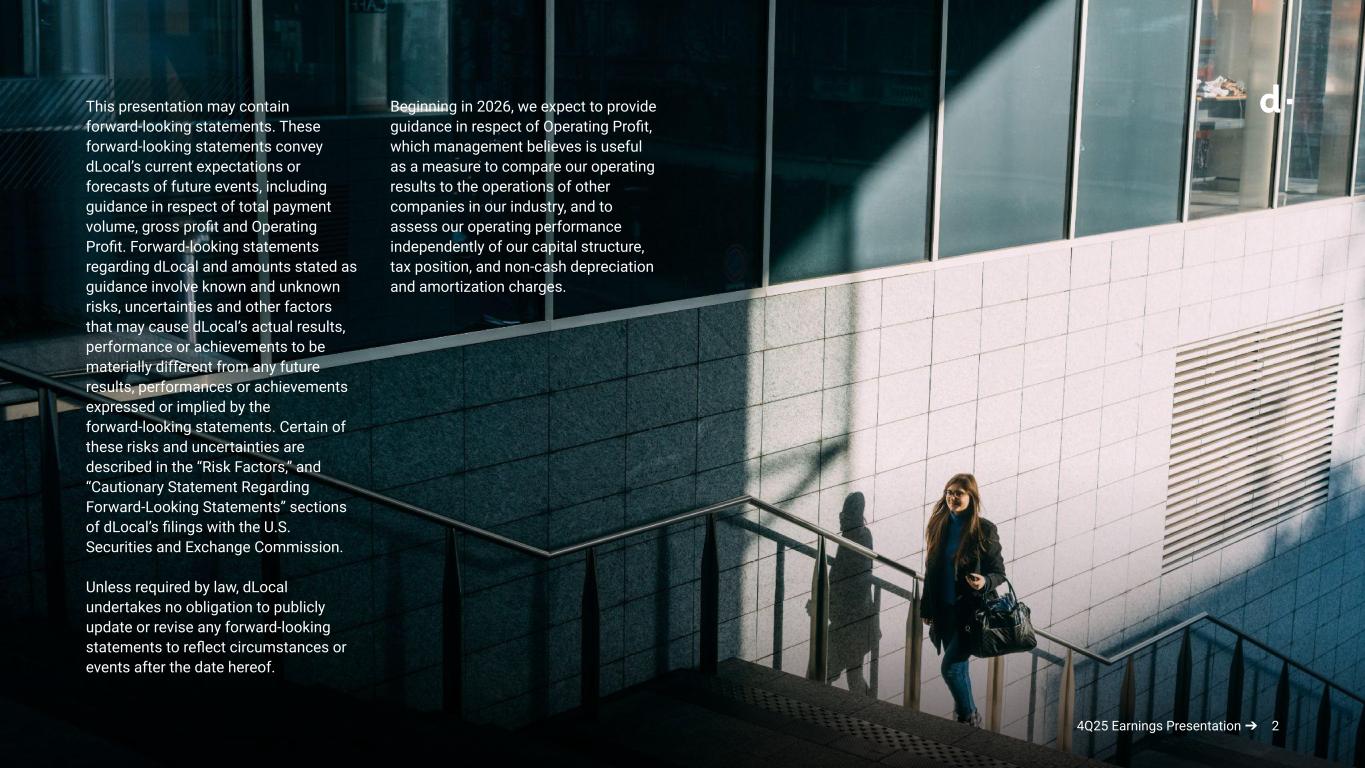 24Q25 Earnings Presentation ➔ This presentation may contain forward-looking statements. These forward-looking statements convey dLocal’s current expectations or forecasts of future events, including guidance in respect of total payment volume, gross profit and Operating Profit. Forward-looking statements regarding dLocal and amounts stated as guidance involve known and unknown risks, uncertainties and other factors that may cause dLocal’s actual results, performance or achievements to be materially different from any future results, performances or achievements expressed or implied by the forward-looking statements. Certain of these risks and uncertainties are described in the “Risk Factors,” and “Cautionary Statement Regarding Forward-Looking Statements” sections of dLocal’s filings with the U.S. Securities and Exchange Commission. Unless required by law, dLocal undertakes no obligation to publicly update or revise any forward-looking statements to reflect circumstances or events after the date hereof. Beginning in 2026, we expect to provide guidance in respect of Operating Profit, which management believes is useful as a measure to compare our operating results to the operations of other companies in our industry, and to assess our operating performance independently of our capital structure, tax position, and non-cash depreciation and amortization charges.