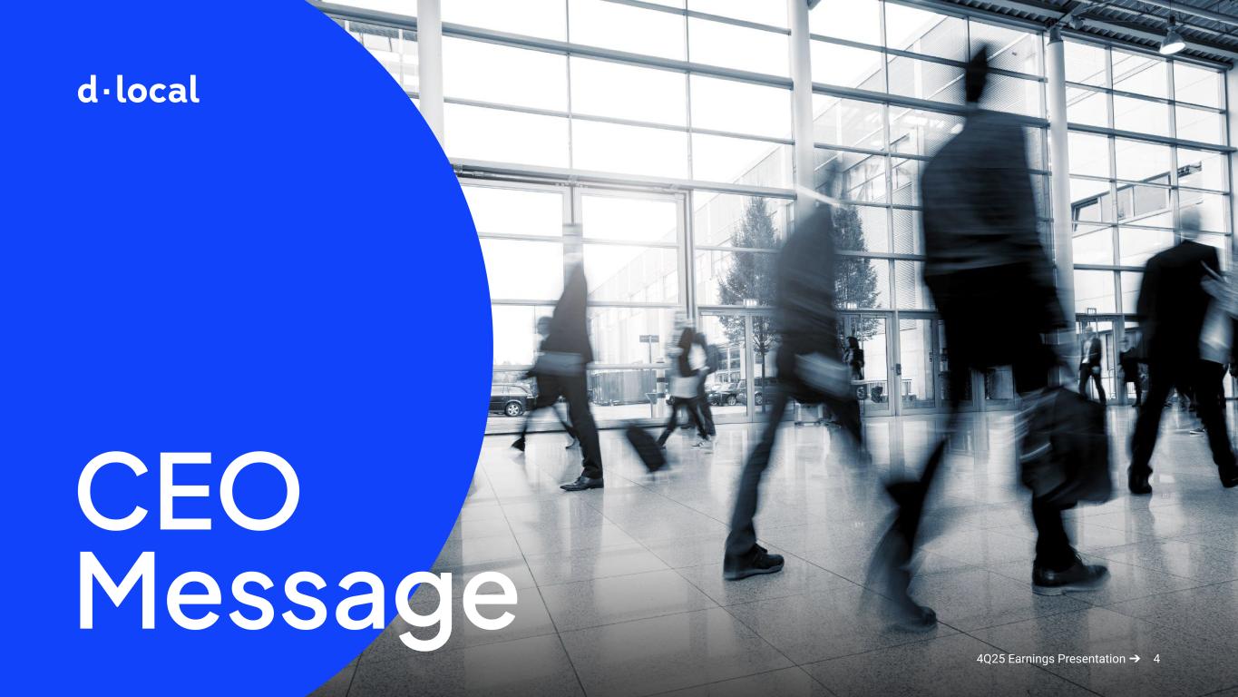 274Q25 Earnings Release Forward-looking statements This presentation may contain forward-looking statements. These forward-looking statements convey dLocal’s current expectations or forecasts of future events, including guidance in respect of total payment volume, gross profit and Operating Profit. Forward-looking statements regarding dLocal and amounts stated as guidance involve known and unknown risks, uncertainties and other factors that may cause dLocal’s actual results, performance or achievements to be materially different from any future results, performances or achievements expressed or implied by the forward-looking statements. Certain of these risks and uncertainties are described in the “Risk Factors,” and “Cautionary Statement Regarding Forward-Looking Statements” sections of dLocal’s filings with the U.S. Securities and Exchange Commission. Unless required by law, dLocal undertakes no obligation to publicly update or revise any forward-looking statements to reflect circumstances or events after the date hereof. Beginning in 2026, we expect to provide guidance in respect of Operating Profit, which management believes is useful as a measure to compare our operating results to the operations of other companies in our industry, and to assess our operating performance independently of our capital structure, tax position, and non-cash depreciation and amortization charges.