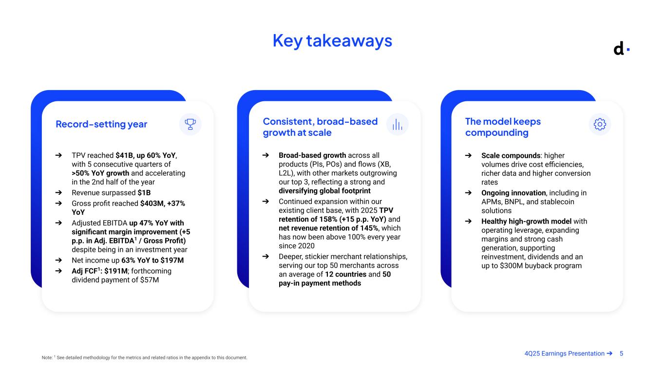 54Q25 Earnings Presentation ➔ Key takeaways Note: 1 See detailed methodology for the metrics and related ratios in the appendix to this document. Record-setting year ➔ TPV reached $41B, up 60% YoY, with 5 consecutive quarters of >50% YoY growth and accelerating in the 2nd half of the year ➔ Revenue surpassed $1B ➔ Gross profit reached $403M, +37% YoY ➔ Adjusted EBITDA up 47% YoY with significant margin improvement (+5 p.p. in Adj. EBITDA1 / Gross Profit) despite being in an investment year ➔ Net income up 63% YoY to $197M ➔ Adj FCF1: $191M; forthcoming dividend payment of $57M Consistent, broad-based growth at scale ➔ Broad-based growth across all products (PIs, POs) and flows (XB, L2L), with other markets outgrowing our top 3, reflecting a strong and diversifying global footprint ➔ Continued expansion within our existing client base, with 2025 TPV retention of 158% (+15 p.p. YoY) and net revenue retention of 145%, which has now been above 100% every year since 2020 ➔ Deeper, stickier merchant relationships, serving our top 50 merchants across an average of 12 countries and 50 pay-in payment methods The model keeps compounding ➔ Scale compounds: higher volumes drive cost efficiencies, richer data and higher conversion rates ➔ Ongoing innovation, including in APMs, BNPL, and stablecoin solutions ➔ Healthy high‑growth model with operating leverage, expanding margins and strong cash generation, supporting reinvestment, dividends and an up to $300M buyback program