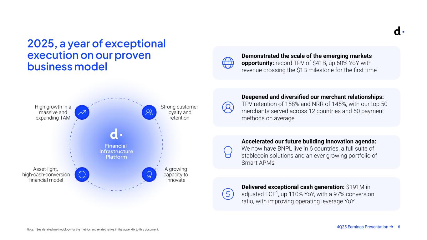 64Q25 Earnings Presentation ➔ 2025, a year of exceptional execution on our proven business model Demonstrated the scale of the emerging markets opportunity: record TPV of $41B, up 60% YoY with revenue crossing the $1B milestone for the first time Deepened and diversified our merchant relationships: TPV retention of 158% and NRR of 145%, with our top 50 merchants served across 12 countries and 50 payment methods on average Accelerated our future building innovation agenda: We now have BNPL live in 6 countries, a full suite of stablecoin solutions and an ever growing portfolio of Smart APMs Delivered exceptional cash generation: $191M in adjusted FCF1, up 110% YoY, with a 97% conversion ratio, with improving operating leverage YoY Note: 1 See detailed methodology for the metrics and related ratios in the appendix to this document.