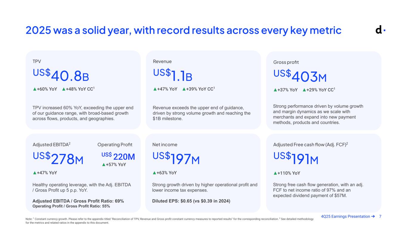 74Q25 Earnings Presentation ➔ 2025 was a solid year, with record results across every key metric TPV increased 60% YoY, exceeding the upper end of our guidance range, with broad-based growth across flows, products, and geographies. US$40.8B ▲+60% YoY ▲+48% YoY CC1 TPV Strong free cash flow generation, with an adj. FCF to net income ratio of 97% and an expected dividend payment of $57M. US$191M ▲+110% YoY Adjusted Free cash flow (Adj. FCF)2 Healthy operating leverage, with the Adj. EBITDA / Gross Profit up 5 p.p. YoY. Adjusted EBITDA / Gross Profit Ratio: 69% Operating Profit / Gross Profit Ratio: 55% US$278M ▲+47% YoY Adjusted EBITDA2 Strong performance driven by volume growth and margin dynamics as we scale with merchants and expand into new payment methods, products and countries. US$403M ▲+37% YoY ▲+29% YoY CC1 Gross profit Strong growth driven by higher operational profit and lower income tax expenses. Diluted EPS: $0.65 (vs $0.39 in 2024) US$197M ▲+63% YoY Net income Revenue exceeds the upper end of guidance, driven by strong volume growth and reaching the $1B milestone. US$1.1B ▲+47% YoY ▲+39% YoY CC1 Revenue Note: 1 Constant currency growth. Please refer to the appendix titled "Reconciliation of TPV, Revenue and Gross profit constant currency measures to reported results" for the corresponding reconciliation. 2 See detailed methodology for the metrics and related ratios in the appendix to this document. Operating Profit US$ 220M ▲+57% YoY