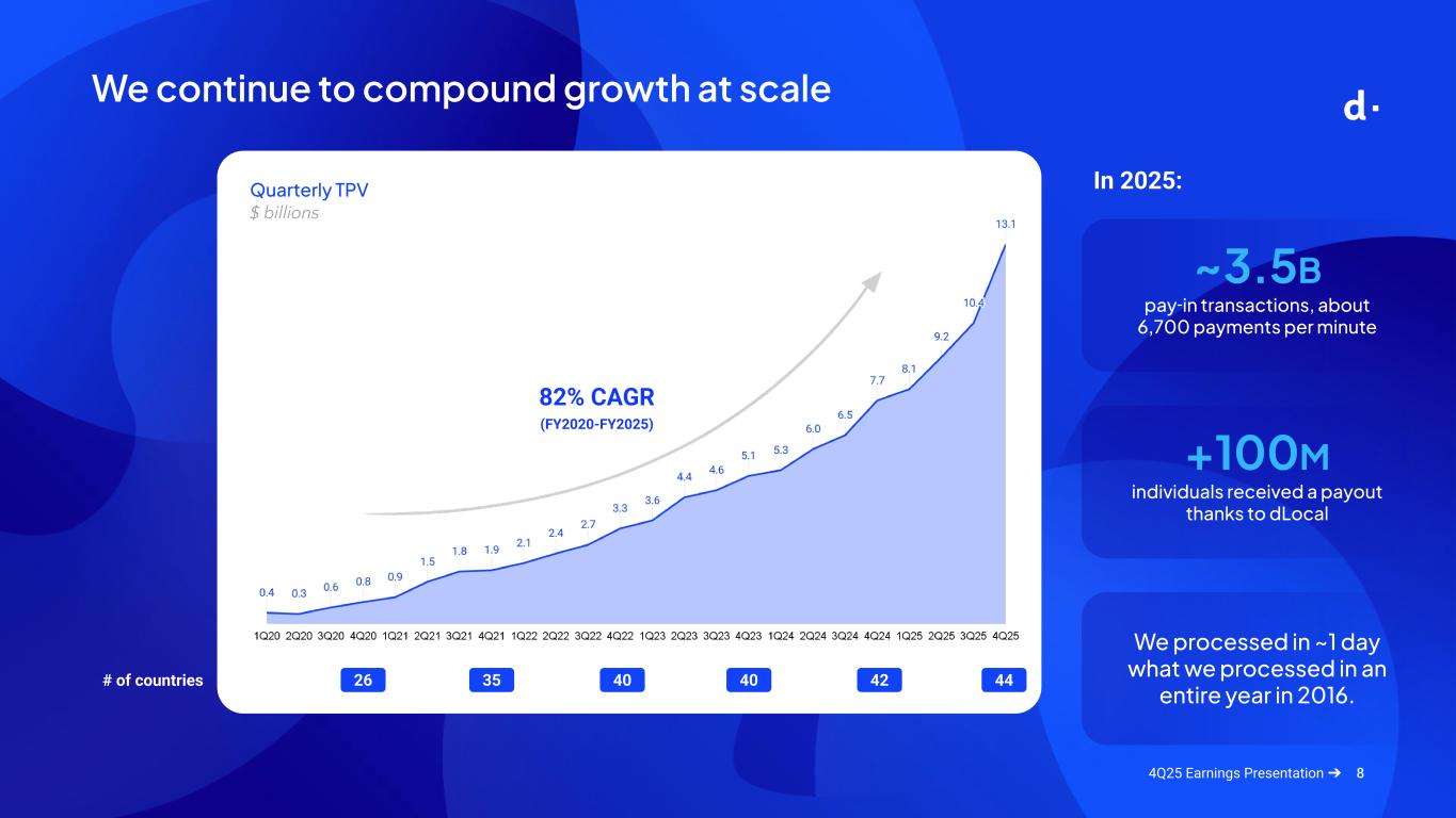 8 # of countries We continue to compound growth at scale 26 35 40 40 42 44 82% CAGR (FY2020-FY2025) ~3.5B pay‑in transactions, about 6,700 payments per minute +100M individuals received a payout thanks to dLocal In 2025: We processed in ~1 day what we processed in an entire year in 2016. Quarterly TPV $ billions 4Q25 Earnings Presentation ➔
