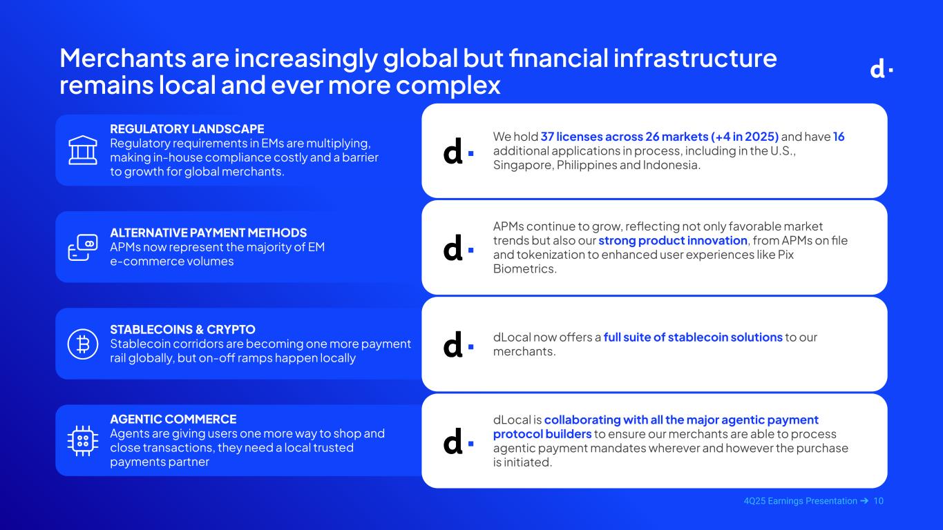 104Q25 Earnings Presentation ➔ Merchants are increasingly global but financial infrastructure remains local and ever more complex REGULATORY LANDSCAPE Regulatory requirements in EMs are multiplying, making in-house compliance costly and a barrier to growth for global merchants. We hold 37 licenses across 26 markets (+4 in 2025) and have 16 additional applications in process, including in the U.S., Singapore, Philippines and Indonesia. ALTERNATIVE PAYMENT METHODS APMs now represent the majority of EM e-commerce volumes APMs continue to grow, reflecting not only favorable market trends but also our strong product innovation, from APMs on file and tokenization to enhanced user experiences like Pix Biometrics. STABLECOINS & CRYPTO Stablecoin corridors are becoming one more payment rail globally, but on-off ramps happen locally dLocal now offers a full suite of stablecoin solutions to our merchants. AGENTIC COMMERCE Agents are giving users one more way to shop and close transactions, they need a local trusted payments partner dLocal is collaborating with all the major agentic payment protocol builders to ensure our merchants are able to process agentic payment mandates wherever and however the purchase is initiated.