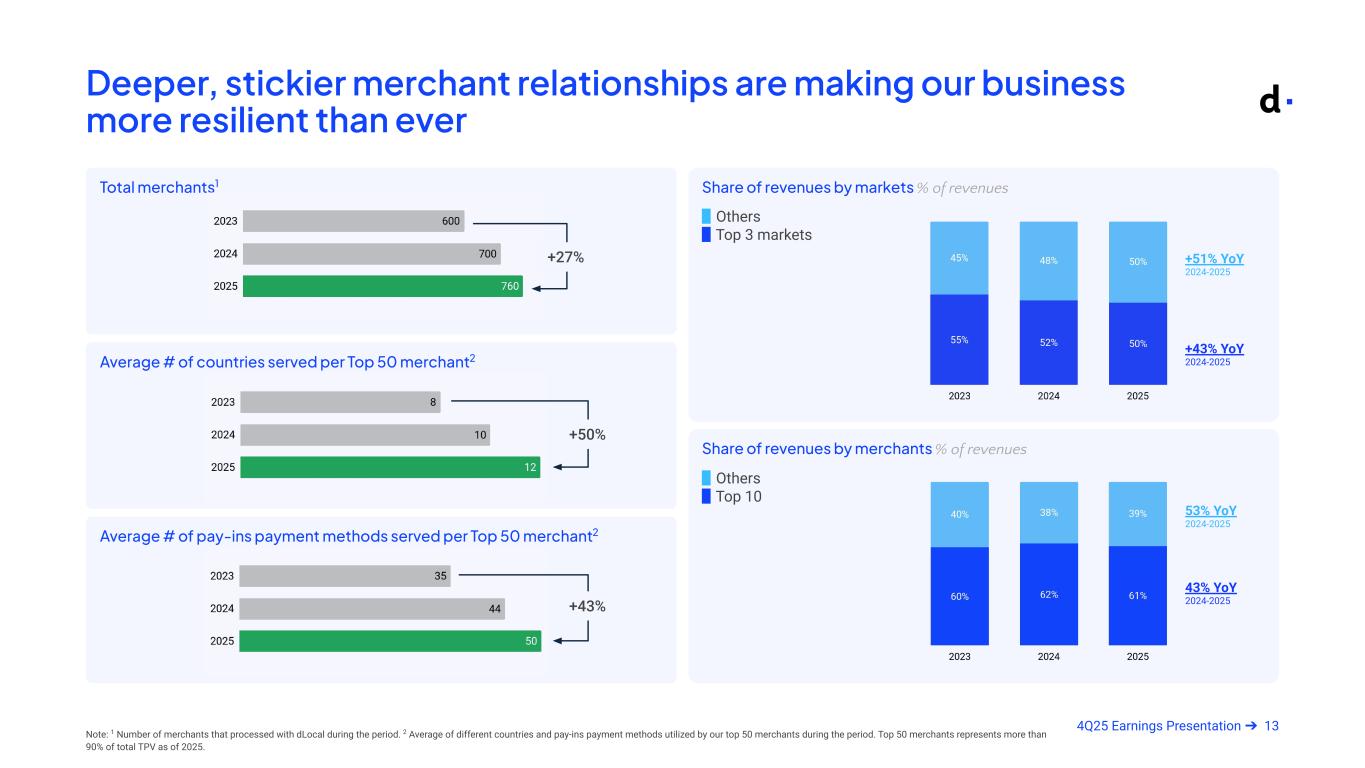 134Q25 Earnings Presentation ➔ Deeper, stickier merchant relationships are making our business more resilient than ever Total merchants1 Average # of countries served per Top 50 merchant2 Average # of pay-ins payment methods served per Top 50 merchant2 Share of revenues by markets % of revenues Share of revenues by merchants % of revenues +51% YoY 2024-2025 +43% YoY 2024-2025 53% YoY 2024-2025 43% YoY 2024-2025 ▉ Others ▉ Top 3 markets ▉ Others ▉ Top 10 Note: 1 Number of merchants that processed with dLocal during the period. 2 Average of different countries and pay-ins payment methods utilized by our top 50 merchants during the period. Top 50 merchants represents more than 90% of total TPV as of 2025. +27% +50% +43%