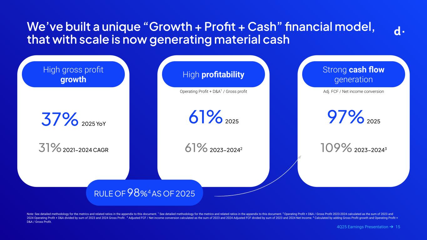 154Q25 Earnings Presentation ➔ Operating Profit + D&A1 / Gross profit High profitability We’ve built a unique “Growth + Profit + Cash” financial model, that with scale is now generating material cash 37% 2025 YoY 31% 2021−2024 CAGR High gross profit growth Strong cash flow generation 61% 2025 61% 2023−20242 Adj. FCF / Net income conversion 97% 2025 109% 2023−20243 Note: See detailed methodology for the metrics and related ratios in the appendix to this document. 1 See detailed methodology for the metrics and related ratios in the appendix to this document. 2 Operating Profit + D&A / Gross Profit 2023-2024 calculated as the sum of 2023 and 2024 Operating Profit + D&A divided by sum of 2023 and 2024 Gross Profit . 3 Adjusted FCF / Net income conversion calculated as the sum of 2023 and 2024 Adjusted FCF divided by sum of 2023 and 2024 Net Income. 4 Calculated by adding Gross Profit growth and Operating Profit + D&A / Gross Profit. In 2025: RULE OF 98%4 AS OF 2025