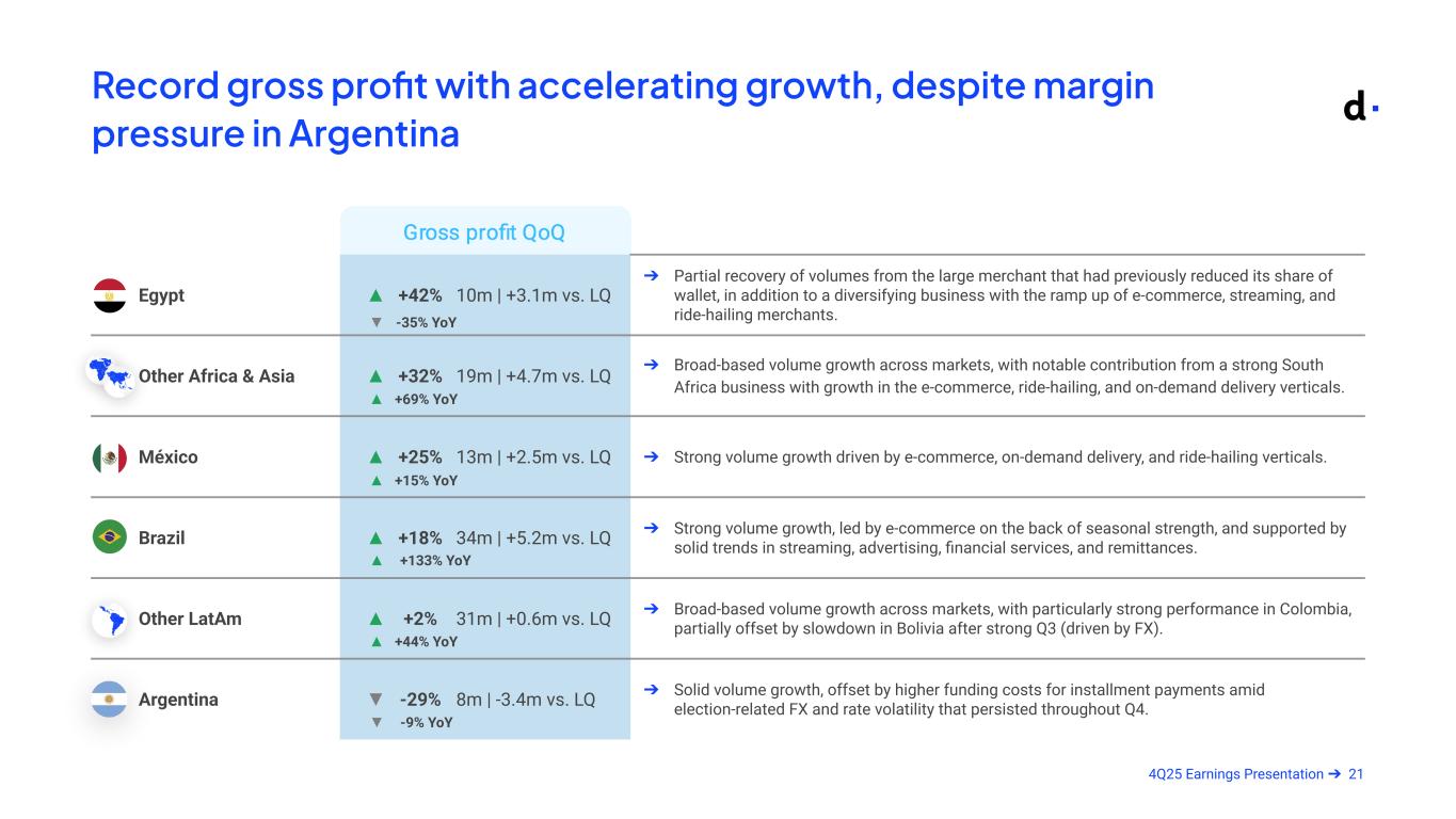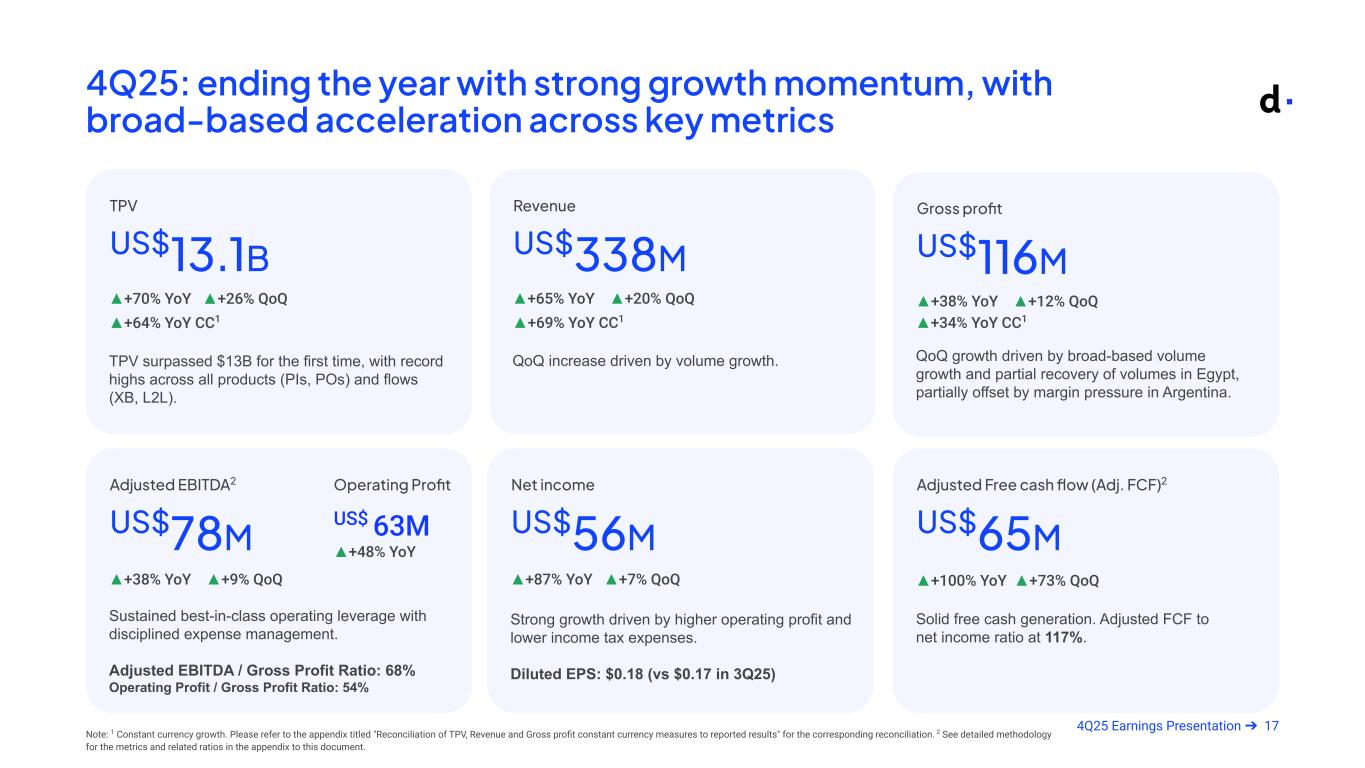 174Q25 Earnings Presentation ➔ 4Q25: ending the year with strong growth momentum, with broad-based acceleration across key metrics TPV surpassed $13B for the first time, with record highs across all products (PIs, POs) and flows (XB, L2L). US$13.1B ▲+70% YoY ▲+26% QoQ TPV Solid free cash generation. Adjusted FCF to net income ratio at 117%. US$65M ▲+100% YoY ▲+73% QoQ Adjusted Free cash flow (Adj. FCF)2 Sustained best-in-class operating leverage with disciplined expense management. Adjusted EBITDA / Gross Profit Ratio: 68% Operating Profit / Gross Profit Ratio: 54% US$78M ▲+38% YoY ▲+9% QoQ Adjusted EBITDA2 QoQ growth driven by broad-based volume growth and partial recovery of volumes in Egypt, partially offset by margin pressure in Argentina. US$116M ▲+38% YoY ▲+12% QoQ Gross profit Strong growth driven by higher operating profit and lower income tax expenses. Diluted EPS: $0.18 (vs $0.17 in 3Q25) US$56M ▲+87% YoY ▲+7% QoQ Net income QoQ increase driven by volume growth. US$338M ▲+65% YoY ▲+20% QoQ Revenue ▲+64% YoY CC1 ▲+69% YoY CC1 ▲+34% YoY CC1 Note: 1 Constant currency growth. Please refer to the appendix titled "Reconciliation of TPV, Revenue and Gross profit constant currency measures to reported results" for the corresponding reconciliation. 2 See detailed methodology for the metrics and related ratios in the appendix to this document. Armado Mar 11 @ 9pm Operating Profit US$ 63M ▲+48% YoY
