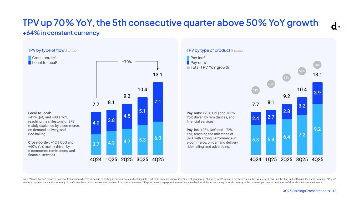 184Q25 Earnings Presentation ➔ TPV up 70% YoY, the 5th consecutive quarter above 50% YoY growth +64% in constant currency TPV by type of flow $ billion Local-to-local: +41% QoQ and +80% YoY, reaching the milestone of $7B, mainly explained by e-commerce, on-demand delivery, and ride-hailing. Cross-border: +12% QoQ and +60% YoY, mainly driven by e-commerce, remittances, and financial services. TPV by type of product $ billion Pay-outs: +23% QoQ and +65% YoY, driven by remittances, and financial services. Pay-ins: +28% QoQ and +72% YoY, reaching the milestone of $9B, with strong performance in e-commerce, on-demand delivery, ride-hailing, and advertising. ▉ Pay-ins3 ▉ Pay-outs4 ⬤ Total TPV YoY growth ▉ Cross-border¹ ▉ Local-to-local² Note: 1“Cross-border” means a payment transaction whereby dLocal is collecting in one currency and settling into a different currency and/or in a different geography. 2“Local-to-local” means a payment transaction whereby dLocal is collecting and settling in the same currency. 3”Pay-in” means a payment transaction whereby dLocal’s merchant customers receive payment from their customers. 4“Pay-out” means a payment transaction whereby dLocal disburses money in local currency to the business partners or customers of dLocal’s merchant customers. 70% 59% 51% 53% 53% +70%