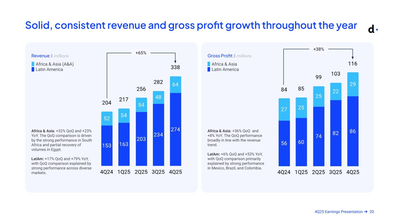 404Q25 Earnings Presentation ➔ Gross profit breakdown by geography Note: Unaudited quarterly results In millions of US$ 4Q24 1Q25 2Q25 3Q25 4Q25 2024 2025 Brazil 14.8 13.0 24.3 29.3 34.4 67.3 101.0 Argentina 9.2 10.6 14.1 11.8 8.3 28.7 44.8 Mexico 10.9 10.8 11.9 10.0 12.6 42.5 45.2 Other Latam 21.6 25.1 23.4 30.4 31.1 75.7 109.9 Latin America 56.4 59.5 73.6 81.5 86.4 214.2 301.0 Egypt 16.0 16.3 12.9 7.3 10.3 48.4 46.8 Other Africa & Asia 11.3 9.1 12.4 14.4 19.0 32.1 54.9 Africa & Asia 27.3 25.4 25.3 21.7 29.4 80.5 101.7 Total Gross Profit 83.7 84.9 98.9 103.2 115.8 294.7 402.8
