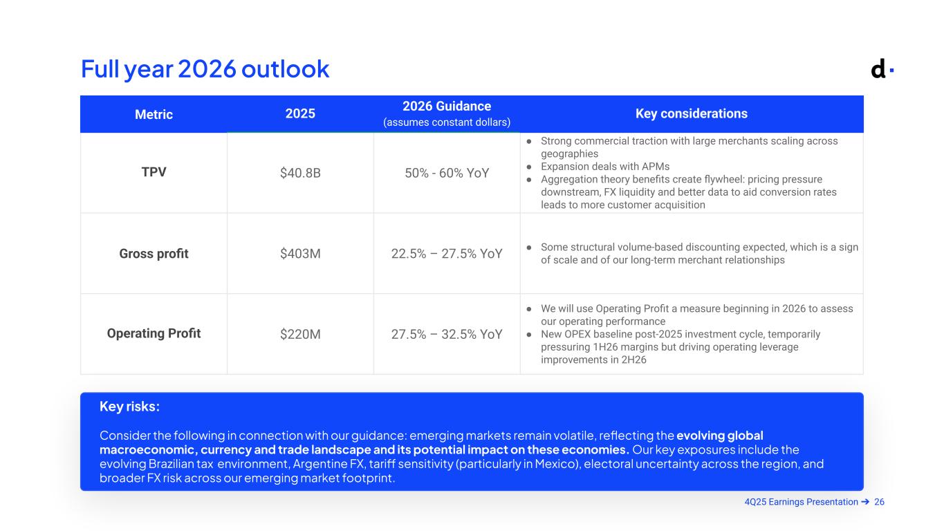 264Q25 Earnings Presentation ➔ Metric 2025 2026 Guidance (assumes constant dollars) Key considerations TPV $40.8B 50% - 60% YoY ● Strong commercial traction with large merchants scaling across geographies ● Expansion deals with APMs ● Aggregation theory benefits create flywheel: pricing pressure downstream, FX liquidity and better data to aid conversion rates leads to more customer acquisition Gross profit $403M 22.5% – 27.5% YoY ● Some structural volume-based discounting expected, which is a sign of scale and of our long-term merchant relationships Operating Profit $220M 27.5% – 32.5% YoY ● We will use Operating Profit a measure beginning in 2026 to assess our operating performance ● New OPEX baseline post-2025 investment cycle, temporarily pressuring 1H26 margins but driving operating leverage improvements in 2H26 Full year 2026 outlook Key risks: Consider the following in connection with our guidance: emerging markets remain volatile, reflecting the evolving global macroeconomic, currency and trade landscape and its potential impact on these economies. Our key exposures include the evolving Brazilian tax environment, Argentine FX, tariff sensitivity (particularly in Mexico), electoral uncertainty across the region, and broader FX risk across our emerging market footprint. Armado Mar 11 @ 9pm