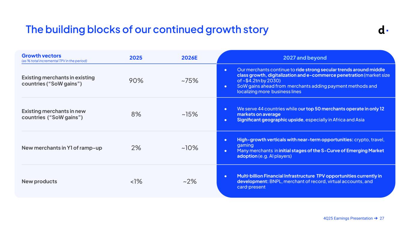 274Q25 Earnings Presentation ➔ The building blocks of our continued growth story Growth vectors (as % total incremental TPV in the period) 2025 2026E 2027 and beyond Existing merchants in existing countries (“SoW gains”) 90% ~75% ● Our merchants continue to ride strong secular trends around middle class growth, digitalization and e-commerce penetration (market size of ~$4.2tn by 2030) ● SoW gains ahead from merchants adding payment methods and localizing more business lines Existing merchants in new countries (“SoW gains”) 8% ~15% ● We serve 44 countries while our top 50 merchants operate in only 12 markets on average ● Significant geographic upside, especially in Africa and Asia New merchants in Y1 of ramp-up 2% ~10% ● High-growth verticals with near-term opportunities: crypto, travel, gaming ● Many merchants in initial stages of the S-Curve of Emerging Market adoption (e.g. AI players) New products <1% ~2% ● Multi‑billion Financial Infrastructure TPV opportunities currently in development: BNPL, merchant of record, virtual accounts, and card‑present
