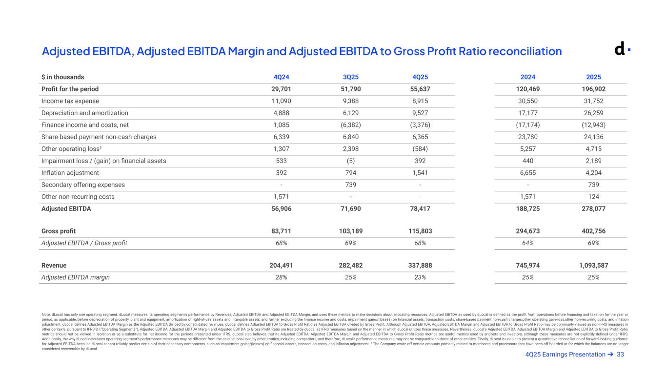 164Q25 Earnings Release The table below presents a reconciliation of dLocal’s Adjusted EBITDA to net income: Note: 1 The Company wrote off certain amounts primarily related to merchants and processors that have been off-boarded or for which the balances are no longer considered recoverable by dLocal. Adjusted EBITDA, Adjusted EBITDA Margin and Adjusted EBITDA to Gross Profit Ratio reconciliation / Financial highlights dLocal has only one operating segment. dLocal measures its operating segment’s performance by Revenues, Adjusted EBITDA and Adjusted EBITDA Margin, and uses these metrics to make decisions about allocating resources. Adjusted EBITDA as used by dLocal is defined as the profit from operations before financing and taxation for the year or period, as applicable, before depreciation of property, plant and equipment, amortization of right-of-use assets and intangible assets, and further excluding the finance income and costs, impairment gains/(losses) on financial assets, transaction costs, share-based payment non-cash charges,other operating gain/loss,other non-recurring costs, and inflation adjustment. dLocal defines Adjusted EBITDA Margin as the Adjusted EBITDA divided by consolidated revenues. dLocal defines Adjusted EBITDA to Gross Profit Ratio as Adjusted EBITDA divided by Gross Profit. Although Adjusted EBITDA, Adjusted EBITDA Margin and Adjusted EBITDA to Gross Profit Ratio may be commonly viewed as non-IFRS measures in other contexts, pursuant to IFRS 8, (“Operating Segments”), Adjusted EBITDA, Adjusted EBITDA Margin and Adjusted EBITDA to Gross Profit Ratio are treated by dLocal as IFRS measures based on the manner in which dLocal utilizes these measures. Nevertheless, dLocal’s Adjusted EBITDA, Adjusted EBITDA Margin and Adjusted EBITDA to Gross Profit Ratio metrics should not be viewed in isolation or as a substitute for net income for the periods presented under IFRS. dLocal also believes that its Adjusted EBITDA, Adjusted EBITDA Margin and Adjusted EBITDA to Gross Profit Ratio metrics are useful metrics used by analysts and investors, although these measures are not explicitly defined under IFRS. Additionally, the way dLocal calculates operating segment’s performance measures may be different from the calculations used by other entities, including competitors, and therefore, dLocal’s performance measures may not be comparable to those of other entities. Finally, dLocal is unable to present a quantitative reconciliation of forward-looking guidance for Adjusted EBITDA because dLocal cannot reliably predict certain of their necessary components, such as impairment gains/(losses) on financial assets, transaction costs, and inflation adjustment. $ in thousands Three months ended on December 31 Year ended on December 31 2025 2024 2025 2024 Profit for the period 55,637 29,701 196,902 120,469 Income tax expense 8,915 11,090 31,752 30,550 Depreciation and amortization 9,527 4,888 26,259 17,177 Finance income and costs, net (3,376) 1,085 (12,943) (17,174) Share-based payment non-cash charges 6,365 6,339 24,136 23,780 Other operating loss¹ (584) 1,307 4,715 5,257 Secondary offering expenses - - 739 - Impairment loss / (gain) on financial assets 392 533 2,189 440 Inflation adjustment 1,541 392 4,204 6,655 Other non-recurring costs - 1,571 124 1,571 Adjusted EBITDA 78,417 56,906 278,077 188,725 Gross profit 115,803 83,711 402,756 294,673 EBITDA to Gross Profit 68% 68% 69% 64% Revenue 337,888 204,491 1,093,587 745,974 EBITDA to Gross Profit 23% 28% 25% 25%