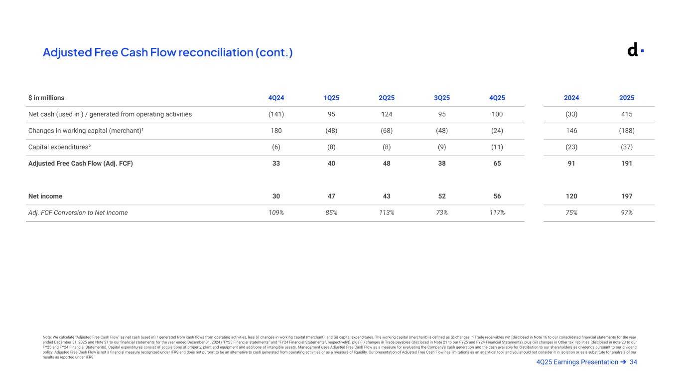 344Q25 Earnings Presentation ➔ Adjusted Free Cash Flow reconciliation (cont.) Note: We calculate “Adjusted Free Cash Flow” as net cash (used in) / generated from cash flows from operating activities, less (i) changes in working capital (merchant), and (ii) capital expenditures. The working capital (merchant) is defined as (i) changes in Trade receivables net (disclosed in Note 16 to our consolidated financial statements for the year ended December 31, 2025 and Note 21 to our financial statements for the year ended December 31, 2024 (“FY25 Financial statements” and “FY24 Financial Statements”, respectively)), plus (ii) changes in Trade payables (disclosed in Note 21 to our FY25 and FY24 Financial Statements), plus (iii) changes in Other tax liabilities (disclosed in note 23 to our FY25 and FY24 Financial Statements). Capital expenditures consist of acquisitions of property, plant and equipment and additions of intangible assets. Management uses Adjusted Free Cash Flow as a measure for evaluating the Company's cash generation and the cash available for distribution to our shareholders as dividends pursuant to our dividend policy. Adjusted Free Cash Flow is not a financial measure recognized under IFRS and does not purport to be an alternative to cash generated from operating activities or as a measure of liquidity. Our presentation of Adjusted Free Cash Flow has limitations as an analytical tool, and you should not consider it in isolation or as a substitute for analysis of our results as reported under IFRS. Armado Mar 11 @ 9pm $ in millions 4Q24 1Q25 2Q25 3Q25 4Q25 2024 2025 Net cash (used in ) / generated from operating activities (141) 95 124 95 100 (33) 415 Changes in working capital (merchant)¹ 180 (48) (68) (48) (24) 146 (188) Capital expenditures² (6) (8) (8) (9) (11) (23) (37) Adjusted Free Cash Flow (Adj. FCF) 33 40 48 38 65 91 191 Net income 30 47 43 52 56 120 197 Adj. FCF Conversion to Net Income 109% 85% 113% 73% 117% 75% 97%