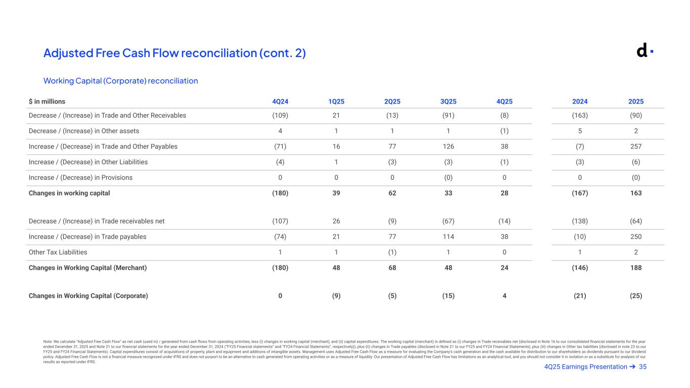 354Q25 Earnings Presentation ➔ Adjusted Free Cash Flow reconciliation (cont. 2) Armado Mar 11 @ 9pm $ in millions 4Q24 1Q25 2Q25 3Q25 4Q25 2024 2025 Decrease / (Increase) in Trade and Other Receivables (109) 21 (13) (91) (8) (163) (90) Decrease / (Increase) in Other assets 4 1 1 1 (1) 5 2 Increase / (Decrease) in Trade and Other Payables (71) 16 77 126 38 (7) 257 Increase / (Decrease) in Other Liabilities (4) 1 (3) (3) (1) (3) (6) Increase / (Decrease) in Provisions 0 0 0 (0) 0 0 (0) Changes in working capital (180) 39 62 33 28 (167) 163 Decrease / (Increase) in Trade receivables net (107) 26 (9) (67) (14) (138) (64) Increase / (Decrease) in Trade payables (74) 21 77 114 38 (10) 250 Other Tax Liabilities 1 1 (1) 1 0 1 2 Changes in Working Capital (Merchant) (180) 48 68 48 24 (146) 188 Changes in Working Capital (Corporate) 0 (9) (5) (15) 4 (21) (25) Working Capital (Corporate) reconciliation Note: We calculate “Adjusted Free Cash Flow” as net cash (used in) / generated from cash flows from operating activities, less (i) changes in working capital (merchant), and (ii) capital expenditures. The working capital (merchant) is defined as (i) changes in Trade receivables net (disclosed in Note 16 to our consolidated financial statements for the year ended December 31, 2025 and Note 21 to our financial statements for the year ended December 31, 2024 (“FY25 Financial statements” and “FY24 Financial Statements”, respectively)), plus (ii) changes in Trade payables (disclosed in Note 21 to our FY25 and FY24 Financial Statements), plus (iii) changes in Other tax liabilities (disclosed in note 23 to our FY25 and FY24 Financial Statements). Capital expenditures consist of acquisitions of property, plant and equipment and additions of intangible assets. Management uses Adjusted Free Cash Flow as a measure for evaluating the Company's cash generation and the cash available for distribution to our shareholders as dividends pursuant to our dividend policy. Adjusted Free Cash Flow is not a financial measure recognized under IFRS and does not purport to be an alternative to cash generated from operating activities or as a measure of liquidity. Our presentation of Adjusted Free Cash Flow has limitations as an analytical tool, and you should not consider it in isolation or as a substitute for analysis of our results as reported under IFRS.