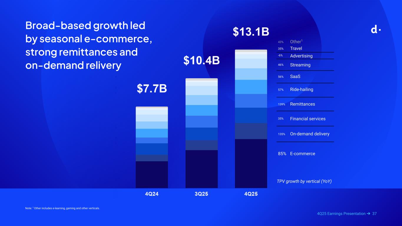 374Q25 Earnings Presentation ➔ Broad-based growth led by seasonal e-commerce, strong remittances and on-demand relivery TPV growth by vertical (YoY) 85% E-commerce 135% On-demand delivery 35% Financial services 139% Remittances 57% Ride-hailing 56% SaaS 46% Streaming -6% Advertising 35% Travel Note: 1 Other includes e-learning, gaming and other verticals. 43% Other1