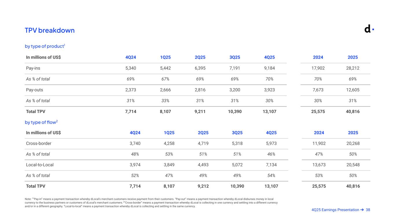 384Q25 Earnings Presentation ➔ TPV breakdown Note: 1”Pay-in” means a payment transaction whereby dLocal’s merchant customers receive payment from their customers. “Pay-out” means a payment transaction whereby dLocal disburses money in local currency to the business partners or customers of dLocal’s merchant customers. 2“Cross-border” means a payment transaction whereby dLocal is collecting in one currency and settling into a different currency and/or in a different geography. “Local-to-local” means a payment transaction whereby dLocal is collecting and settling in the same currency. by type of product1 by type of flow2 In millions of US$ 4Q24 1Q25 2Q25 3Q25 4Q25 2024 2025 Pay-ins 5,340 5,442 6,395 7,191 9,184 17,902 28,212 As % of total 69% 67% 69% 69% 70% 70% 69% Pay-outs 2,373 2,666 2,816 3,200 3,923 7,673 12,605 As % of total 31% 33% 31% 31% 30% 30% 31% Total TPV 7,714 8,107 9,211 10,390 13,107 25,575 40,816 In millions of US$ 4Q24 1Q25 2Q25 3Q25 4Q25 2024 2025 Cross-border 3,740 4,258 4,719 5,318 5,973 11,902 20,268 As % of total 48% 53% 51% 51% 46% 47% 50% Local-to-Local 3,974 3,849 4,493 5,072 7,134 13,673 20,548 As % of total 52% 47% 49% 49% 54% 53% 50% Total TPV 7,714 8,107 9,212 10,390 13,107 25,575 40,816