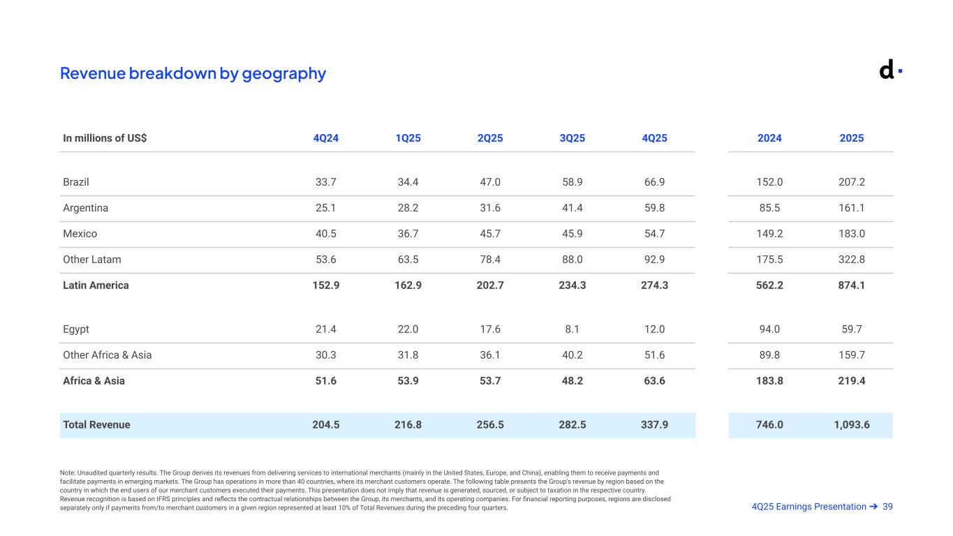 394Q25 Earnings Presentation ➔ Revenue breakdown by geography Note: Unaudited quarterly results. The Group derives its revenues from delivering services to international merchants (mainly in the United States, Europe, and China), enabling them to receive payments and facilitate payments in emerging markets. The Group has operations in more than 40 countries, where its merchant customers operate. The following table presents the Group’s revenue by region based on the country in which the end users of our merchant customers executed their payments. This presentation does not imply that revenue is generated, sourced, or subject to taxation in the respective country. Revenue recognition is based on IFRS principles and reflects the contractual relationships between the Group, its merchants, and its operating companies. For financial reporting purposes, regions are disclosed separately only if payments from/to merchant customers in a given region represented at least 10% of Total Revenues during the preceding four quarters. In millions of US$ 4Q24 1Q25 2Q25 3Q25 4Q25 2024 2025 Brazil 33.7 34.4 47.0 58.9 66.9 152.0 207.2 Argentina 25.1 28.2 31.6 41.4 59.8 85.5 161.1 Mexico 40.5 36.7 45.7 45.9 54.7 149.2 183.0 Other Latam 53.6 63.5 78.4 88.0 92.9 175.5 322.8 Latin America 152.9 162.9 202.7 234.3 274.3 562.2 874.1 Egypt 21.4 22.0 17.6 8.1 12.0 94.0 59.7 Other Africa & Asia 30.3 31.8 36.1 40.2 51.6 89.8 159.7 Africa & Asia 51.6 53.9 53.7 48.2 63.6 183.8 219.4 Total Revenue 204.5 216.8 256.5 282.5 337.9 746.0 1,093.6 Armado Mar 11 @ 9pm