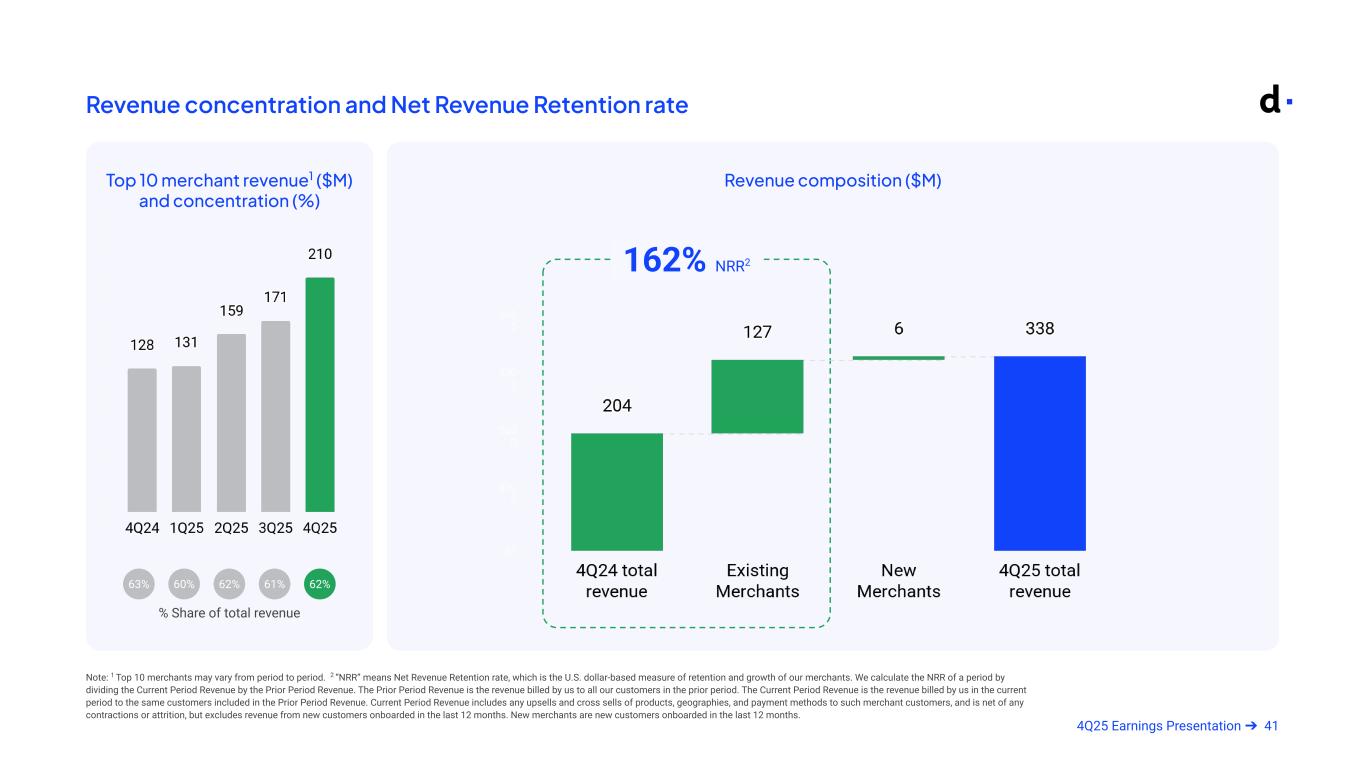 414Q25 Earnings Presentation ➔ Revenue concentration and Net Revenue Retention rate Note: 1 Top 10 merchants may vary from period to period. 2 “NRR” means Net Revenue Retention rate, which is the U.S. dollar-based measure of retention and growth of our merchants. We calculate the NRR of a period by dividing the Current Period Revenue by the Prior Period Revenue. The Prior Period Revenue is the revenue billed by us to all our customers in the prior period. The Current Period Revenue is the revenue billed by us in the current period to the same customers included in the Prior Period Revenue. Current Period Revenue includes any upsells and cross sells of products, geographies, and payment methods to such merchant customers, and is net of any contractions or attrition, but excludes revenue from new customers onboarded in the last 12 months. New merchants are new customers onboarded in the last 12 months. Top 10 merchant revenue1 ($M) and concentration (%) Revenue composition ($M) % Share of total revenue 62%61%63% 60% 62% 162% NRR2