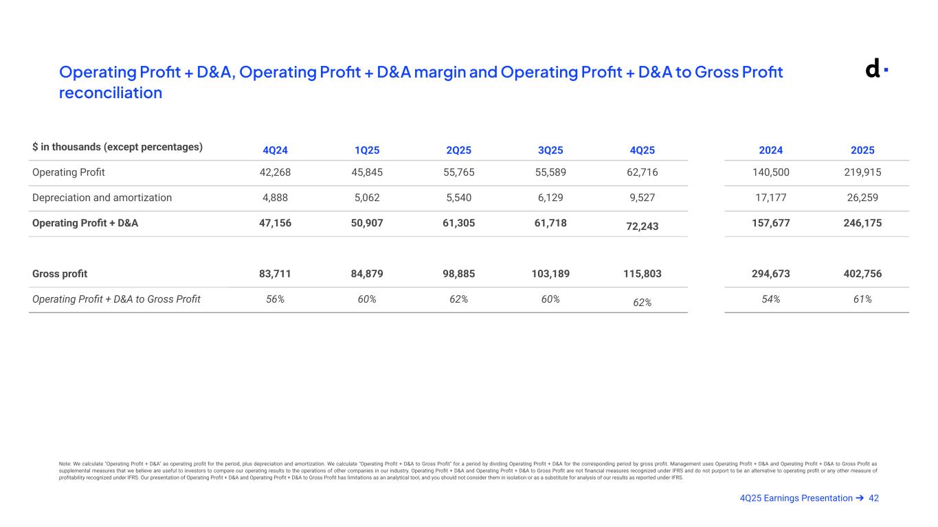 424Q25 Earnings Presentation ➔ Operating Profit + D&A, Operating Profit + D&A margin and Operating Profit + D&A to Gross Profit reconciliation Armado Mar 11 @ 9pm Note: We calculate "Operating Profit + D&A" as operating profit for the period, plus depreciation and amortization. We calculate "Operating Profit + D&A to Gross Profit" for a period by dividing Operating Profit + D&A for the corresponding period by gross profit. Management uses Operating Profit + D&A and Operating Profit + D&A to Gross Profit as supplemental measures that we believe are useful to investors to compare our operating results to the operations of other companies in our industry. Operating Profit + D&A and Operating Profit + D&A to Gross Profit are not financial measures recognized under IFRS and do not purport to be an alternative to operating profit or any other measure of profitability recognized under IFRS. Our presentation of Operating Profit + D&A and Operating Profit + D&A to Gross Profit has limitations as an analytical tool, and you should not consider them in isolation or as a substitute for analysis of our results as reported under IFRS. $ in thousands (except percentages) 4Q24 1Q25 2Q25 3Q25 4Q25 2024 2025 Operating Profit 42,268 45,845 55,765 55,589 62,716 140,500 219,915 Depreciation and amortization 4,888 5,062 5,540 6,129 9,527 17,177 26,259 Operating Profit + D&A 47,156 50,907 61,305 61,718 72,243 157,677 246,175 Gross profit 83,711 84,879 98,885 103,189 115,803 294,673 402,756 Operating Profit + D&A to Gross Profit 56% 60% 62% 60% 62% 54% 61%