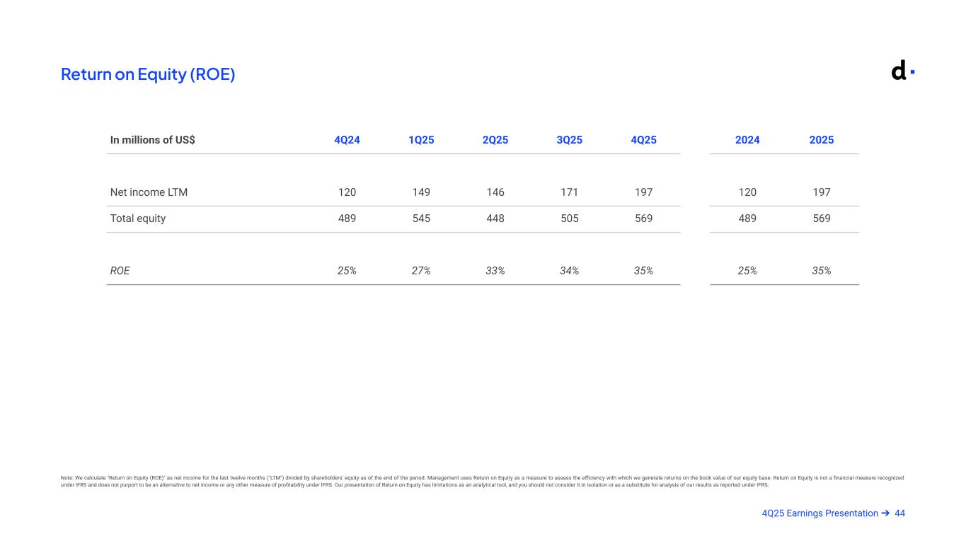 444Q25 Earnings Presentation ➔ Return on Equity (ROE) Note: We calculate "Return on Equity (ROE)" as net income for the last twelve months ("LTM") divided by shareholders' equity as of the end of the period. Management uses Return on Equity as a measure to assess the efficiency with which we generate returns on the book value of our equity base. Return on Equity is not a financial measure recognized under IFRS and does not purport to be an alternative to net income or any other measure of profitability under IFRS. Our presentation of Return on Equity has limitations as an analytical tool, and you should not consider it in isolation or as a substitute for analysis of our results as reported under IFRS. Armado Mar 11 @ 9pm In millions of US$ 4Q24 1Q25 2Q25 3Q25 4Q25 2024 2025 Net income LTM 120 149 146 171 197 120 197 Total equity 489 545 448 505 569 489 569 ROE 25% 27% 33% 34% 35% 25% 35%