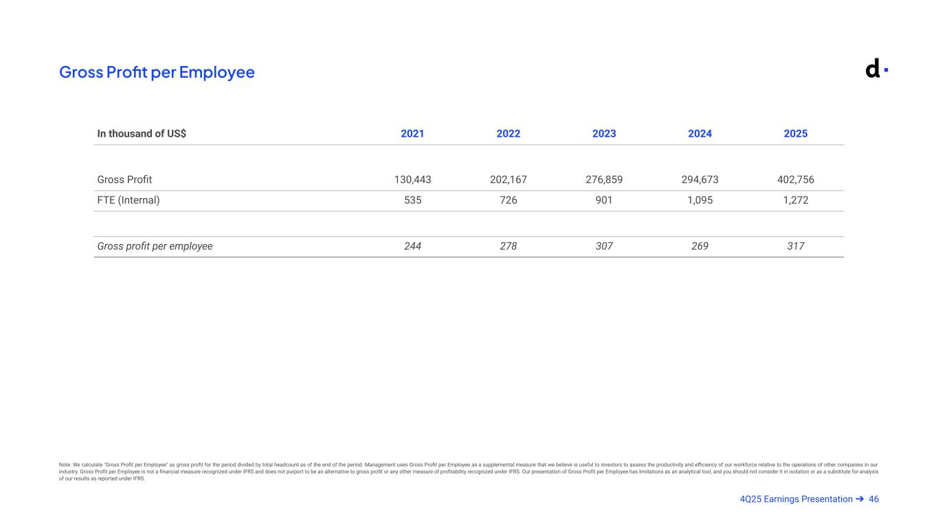 464Q25 Earnings Presentation ➔ Gross Profit per Employee Note: We calculate "Gross Profit per Employee" as gross profit for the period divided by total headcount as of the end of the period. Management uses Gross Profit per Employee as a supplemental measure that we believe is useful to investors to assess the productivity and efficiency of our workforce relative to the operations of other companies in our industry. Gross Profit per Employee is not a financial measure recognized under IFRS and does not purport to be an alternative to gross profit or any other measure of profitability recognized under IFRS. Our presentation of Gross Profit per Employee has limitations as an analytical tool, and you should not consider it in isolation or as a substitute for analysis of our results as reported under IFRS. Armado Mar 11 @ 9pm In thousand of US$ 2021 2022 2023 2024 2025 Gross Profit 130,443 202,167 276,859 294,673 402,756 FTE (Internal) 535 726 901 1,095 1,272 Gross profit per employee 244 278 307 269 317