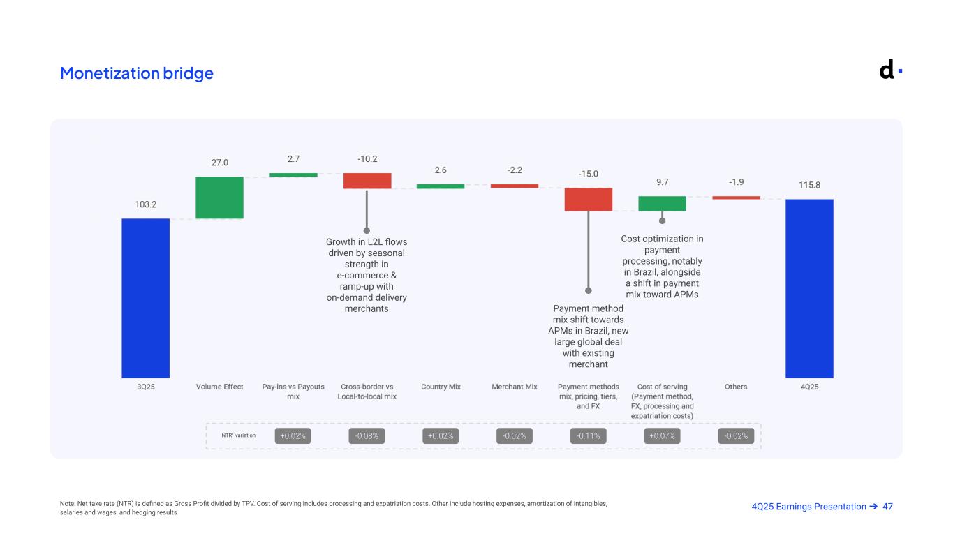 474Q25 Earnings Presentation ➔Note: Net take rate (NTR) is defined as Gross Profit divided by TPV. Cost of serving includes processing and expatriation costs. Other include hosting expenses, amortization of intangibles, salaries and wages, and hedging results +0.02% -0.08% +0.02% -0.02% -0.11% +0.07% -0.02% Monetization bridge NTR1 variation Payment method mix shift towards APMs in Brazil, new large global deal with existing merchant Growth in L2L flows driven by seasonal strength in e-commerce & ramp-up with on-demand delivery merchants Cost optimization in payment processing, notably in Brazil, alongside a shift in payment mix toward APMs